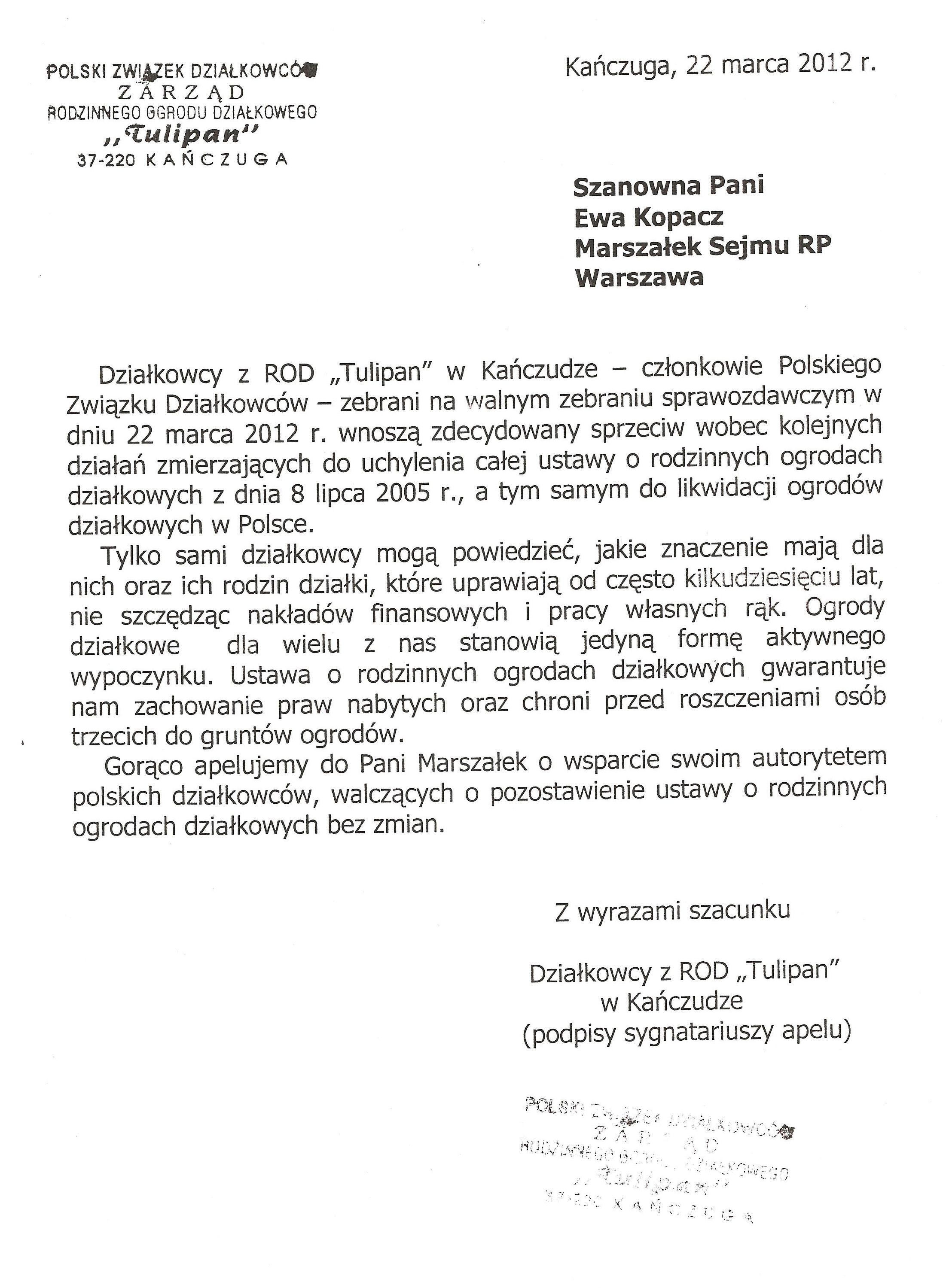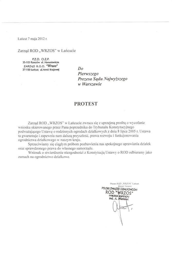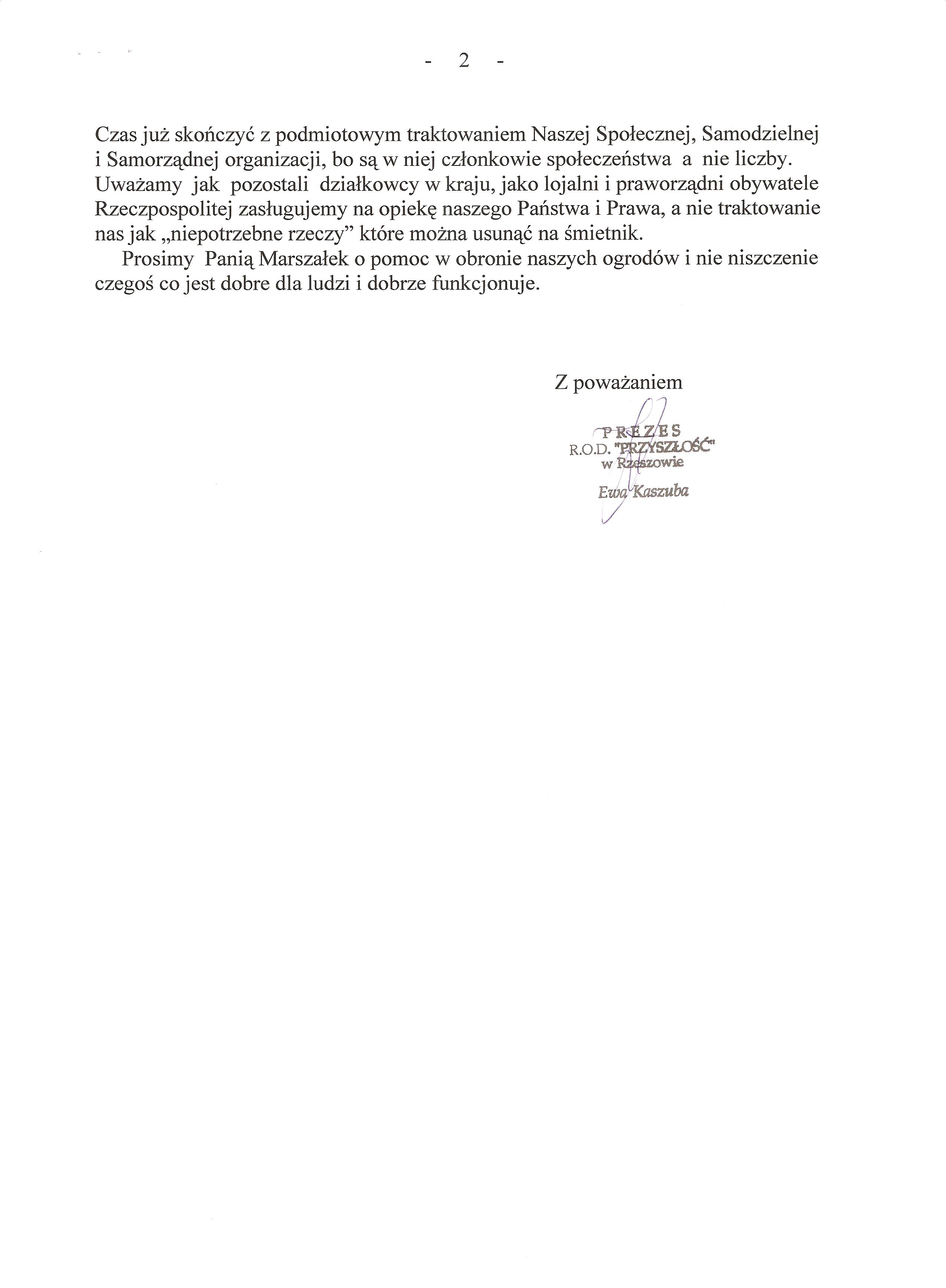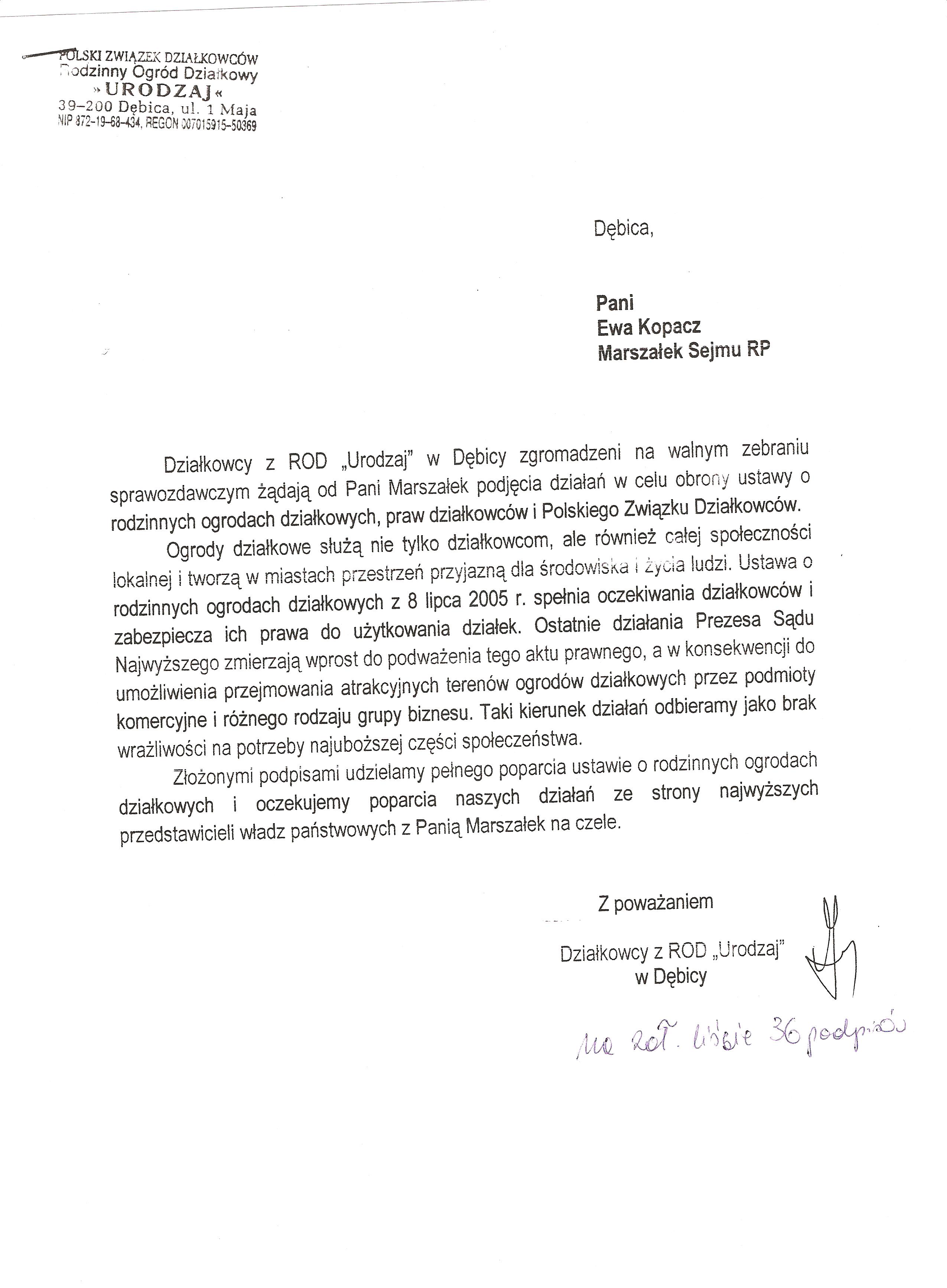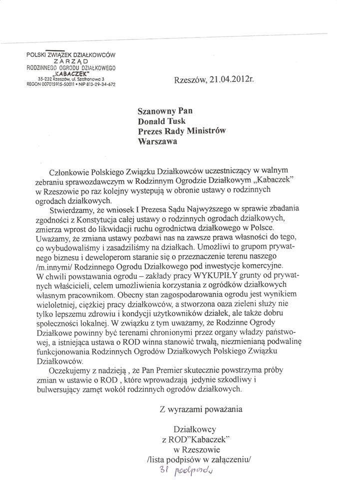 Działając w imieniu rzeszowskich działkowców zwracamy się o pomoc w obronie działkowców, ustawy o rodzinnych ogrodach działkowych i Polskiego Związku Działkowców. Jesteśmy przekonani, że głos najwyższego przedstawiciela Sejmu, przesądzi o pozostawieniu ustawy o ROD w niezmienionej formie i pozwoli na dalsze istnienie oraz rozwój ogrodnictwa działkowego w naszym kraju.