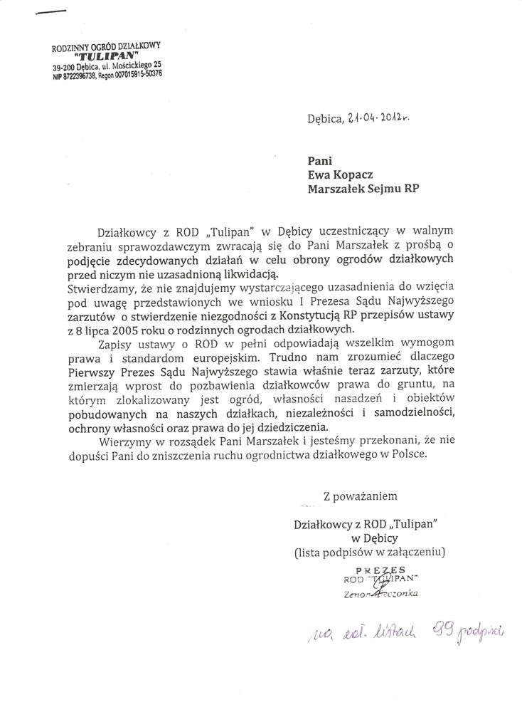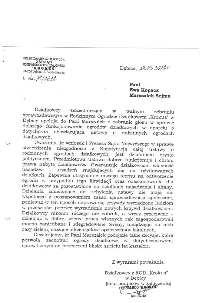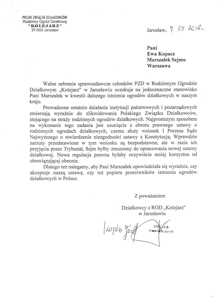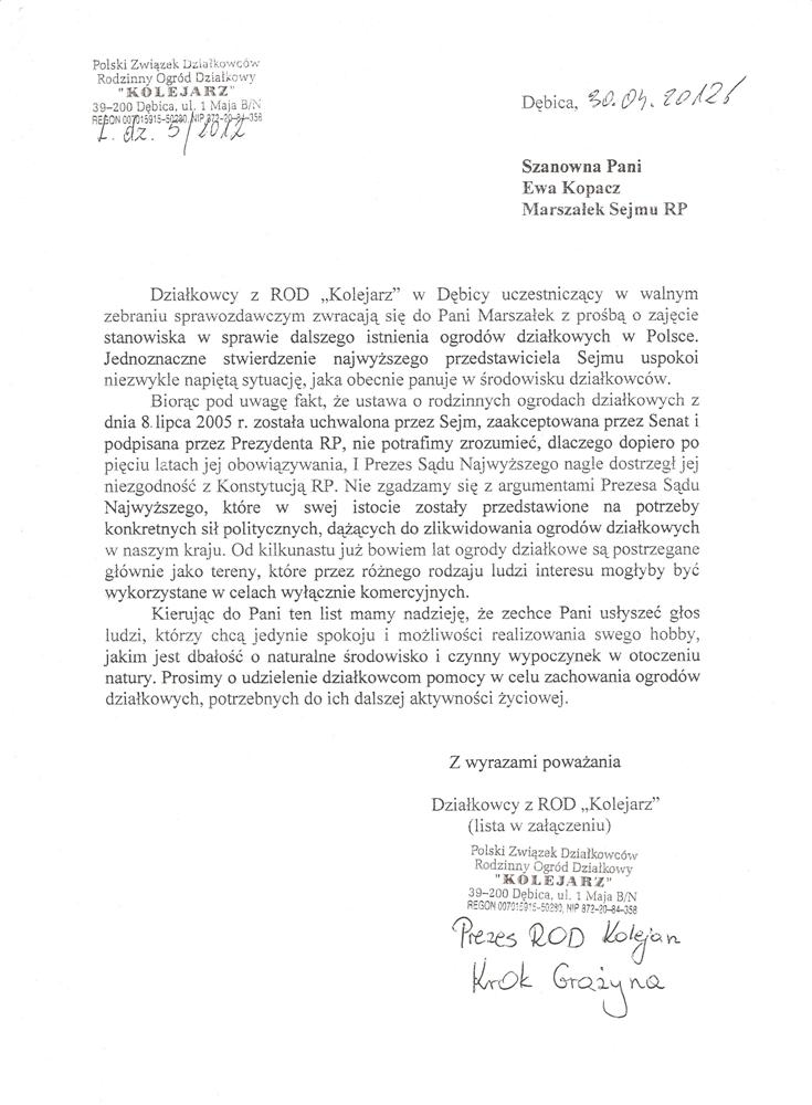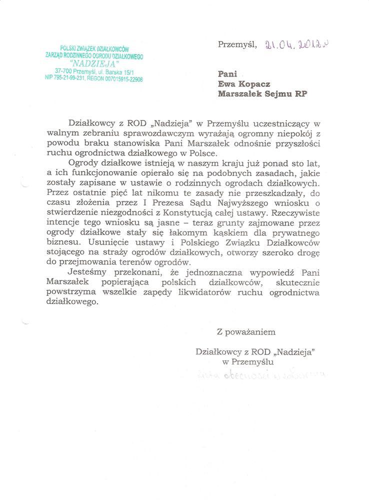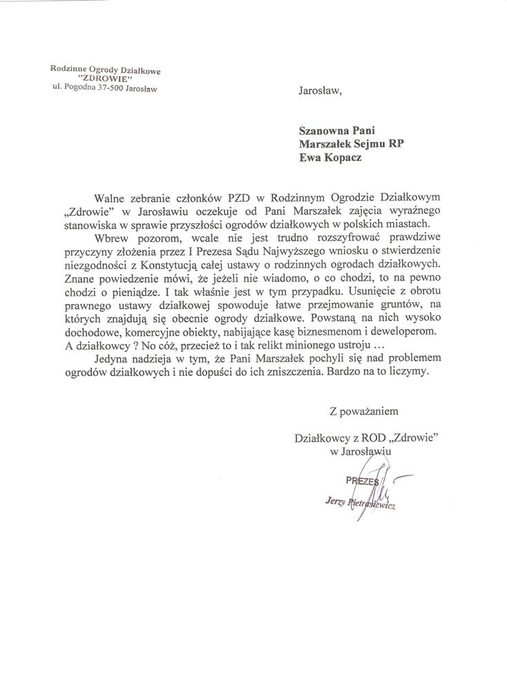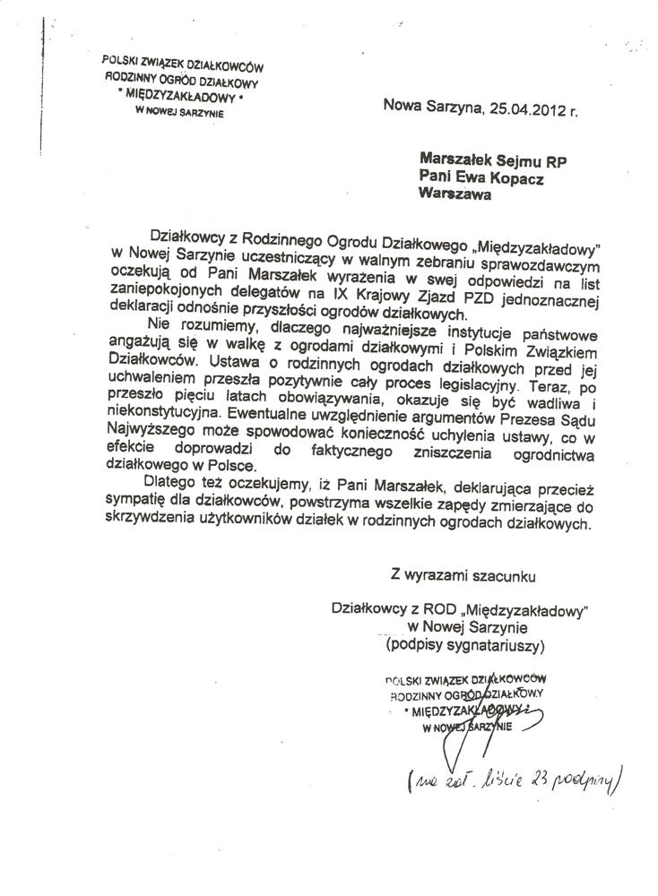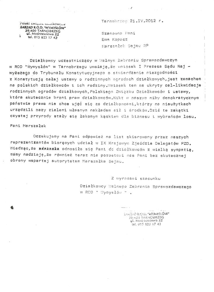 Ja jako Delegat z ziemi tarnobrzeskiej na IX Krajowy Zjazd Delegatów Polskiego Związku Działkowców z wielkim zadowoleniem przyjąłem Pani słowa ujęte w liście skierowane do nas uczestników IX Zjazdu Delegatów . Te słowa przyjąłem jako przejaw sympatii do nas działkowiczów a szczególnie do Ruchu Ogrodnictwa Działkowego w Polsce. Szanowna Pani - występuje w imieniu w imieniu pewnej części Działkowiczów województwa podkarpackiego o wsparcie nas w Sejmie w obronie naszej bardzo dobrej Ustawy o Rodzinnych Ogrodach Działkowych przed zakusami I Prezesa Sądu Najwyższego zaskarżającego ją do Trybunału Konstytucyjnego.