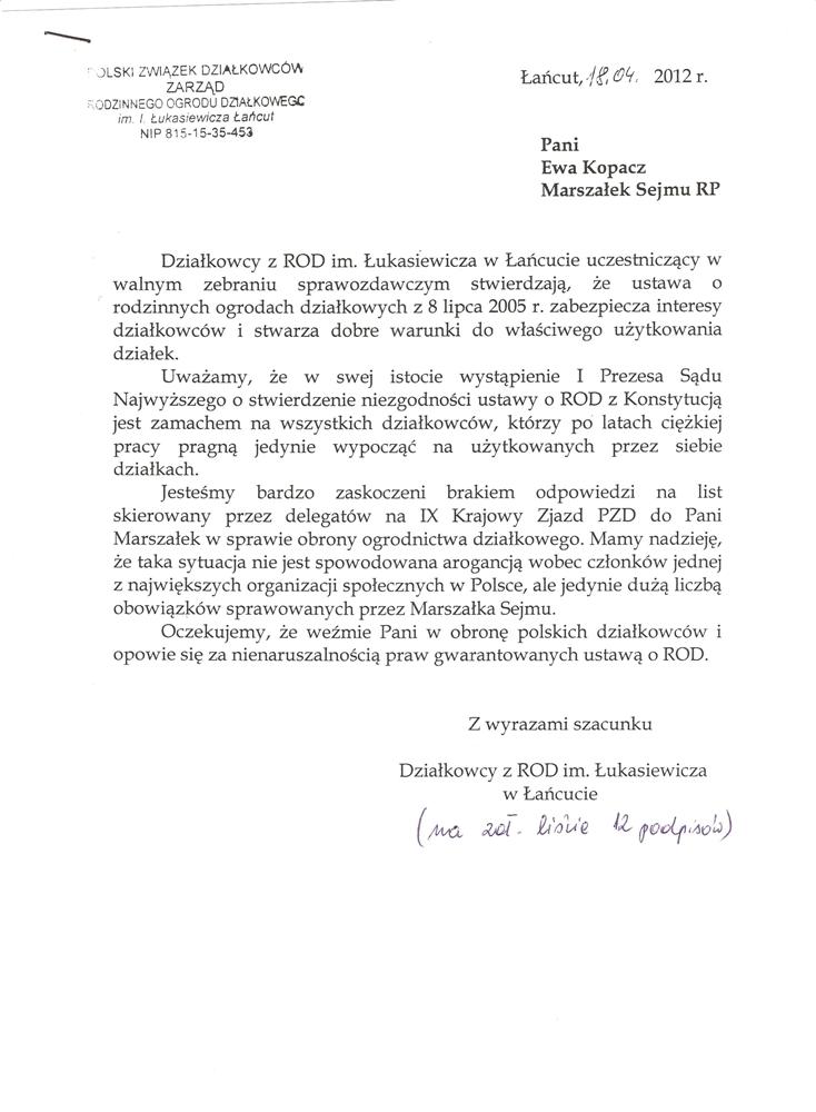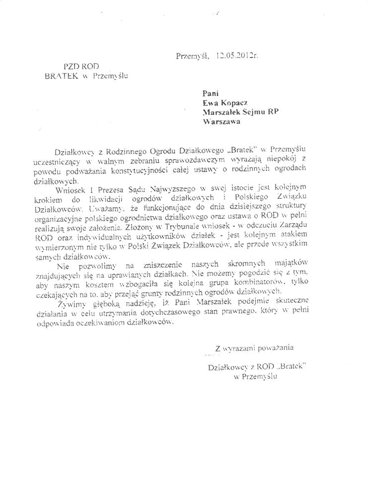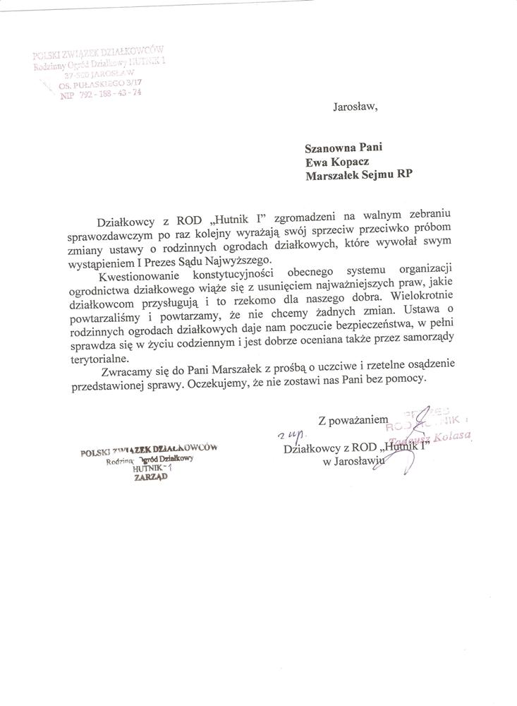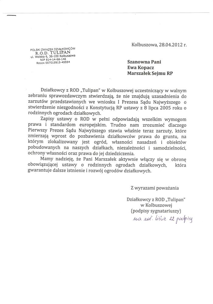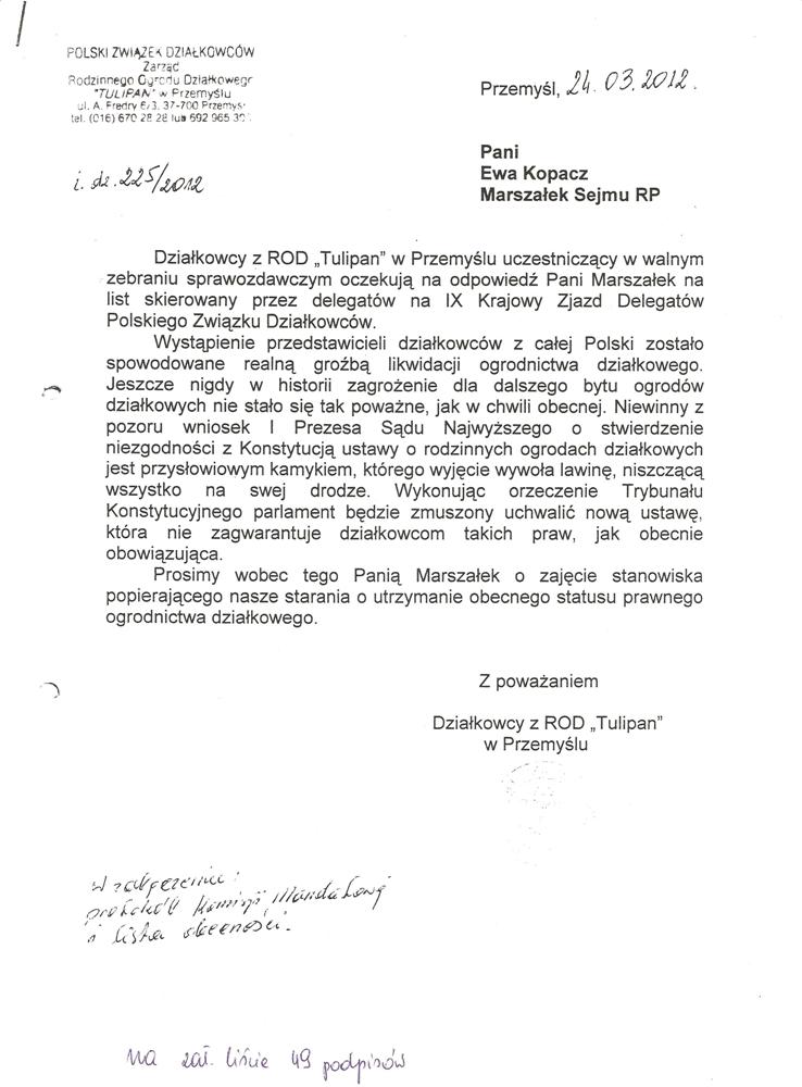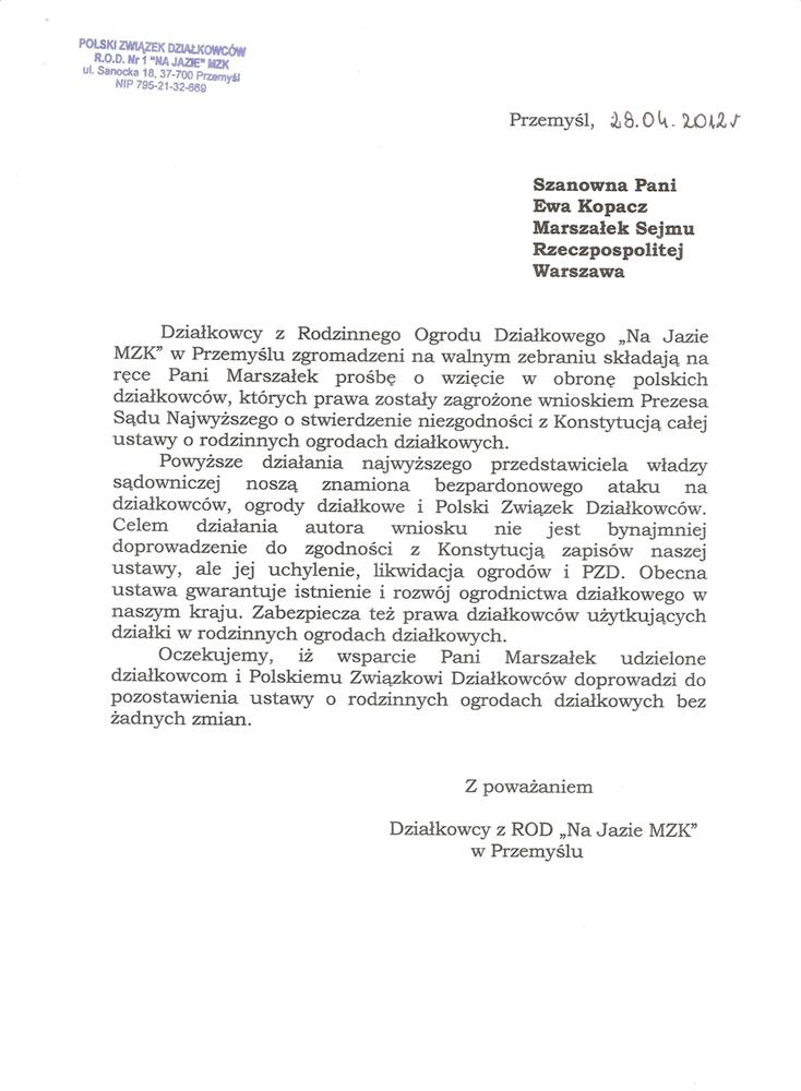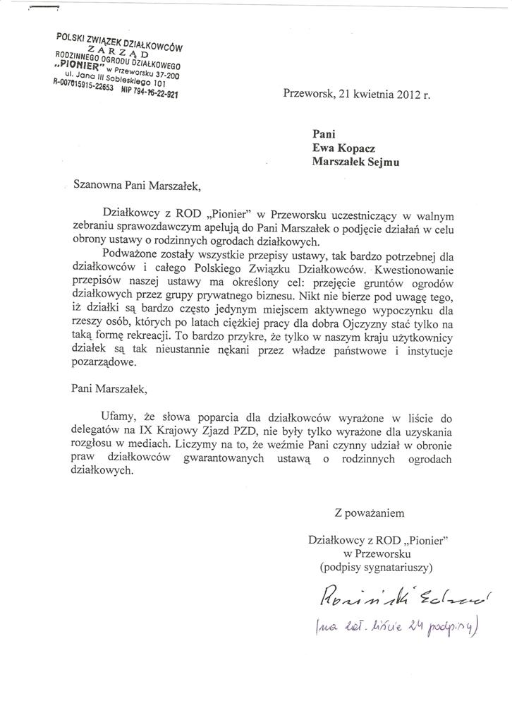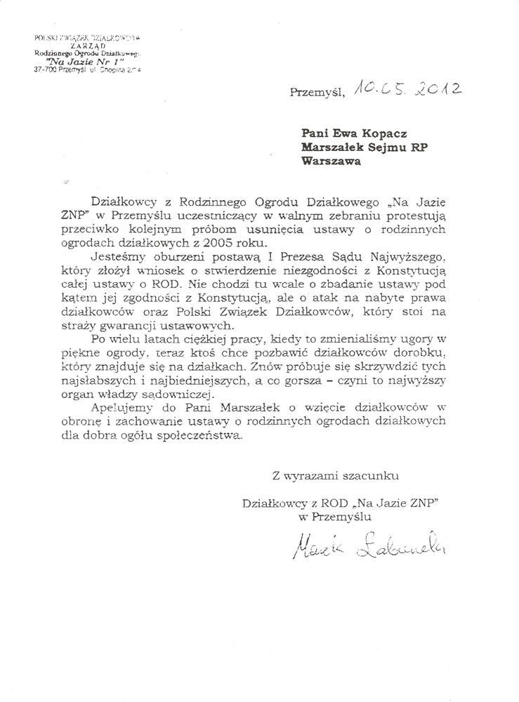 Ja jako Delegat z ziemi tarnobrzeskiej na IX Krajowy Zjazd Delegatów Polskiego Związku Działkowców z wielkim zadowoleniem przyjąłem Pani słowa ujęte w liście skierowane do nas uczestników IX Zjazdu Delegatów . Te słowa przyjąłem jako przejaw sympatii do nas działkowiczów a szczególnie do Ruchu Ogrodnictwa Działkowego w Polsce. Szanowna Pani - występuje w imieniu w imieniu pewnej części Działkowiczów województwa podkarpackiego o wsparcie nas w Sejmie w obronie naszej bardzo dobrej Ustawy o Rodzinnych Ogrodach Działkowych przed zakusami I Prezesa Sądu Najwyższego zaskarżającego ją do Trybunału Konstytucyjnego.