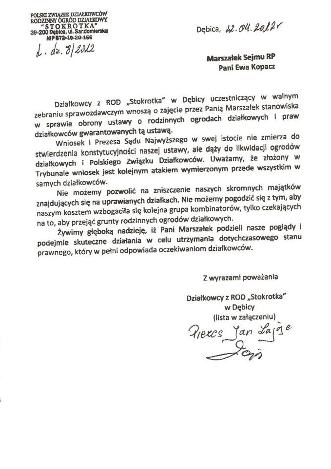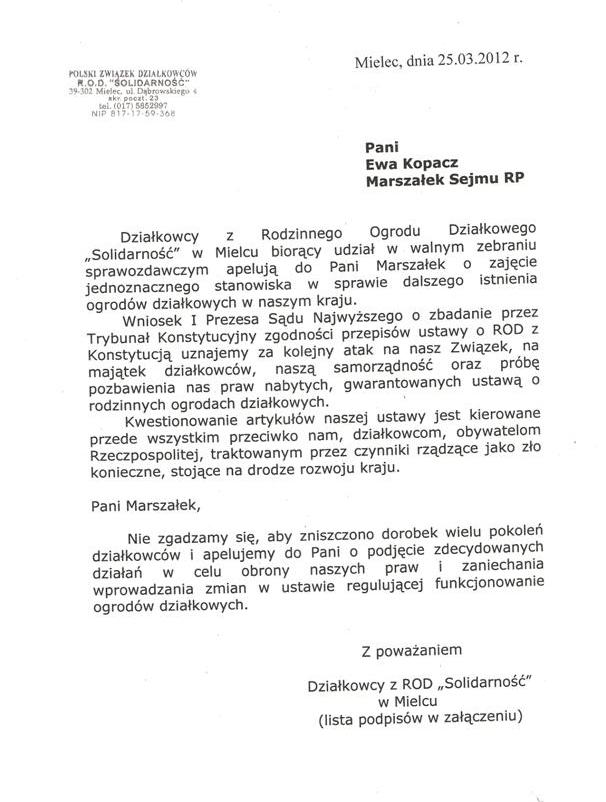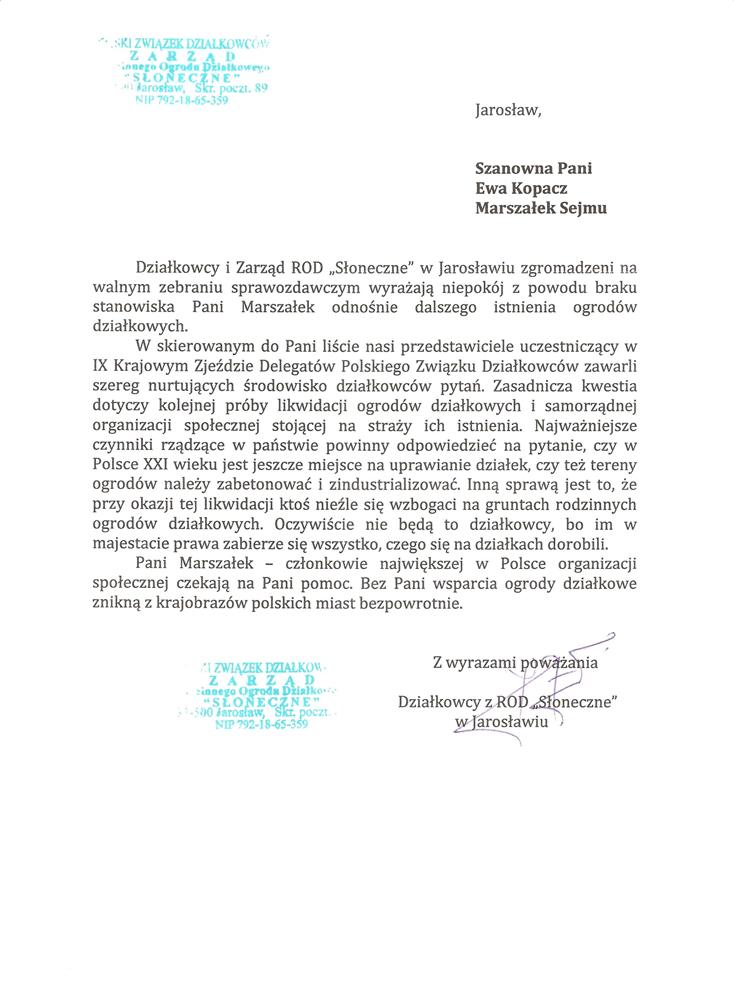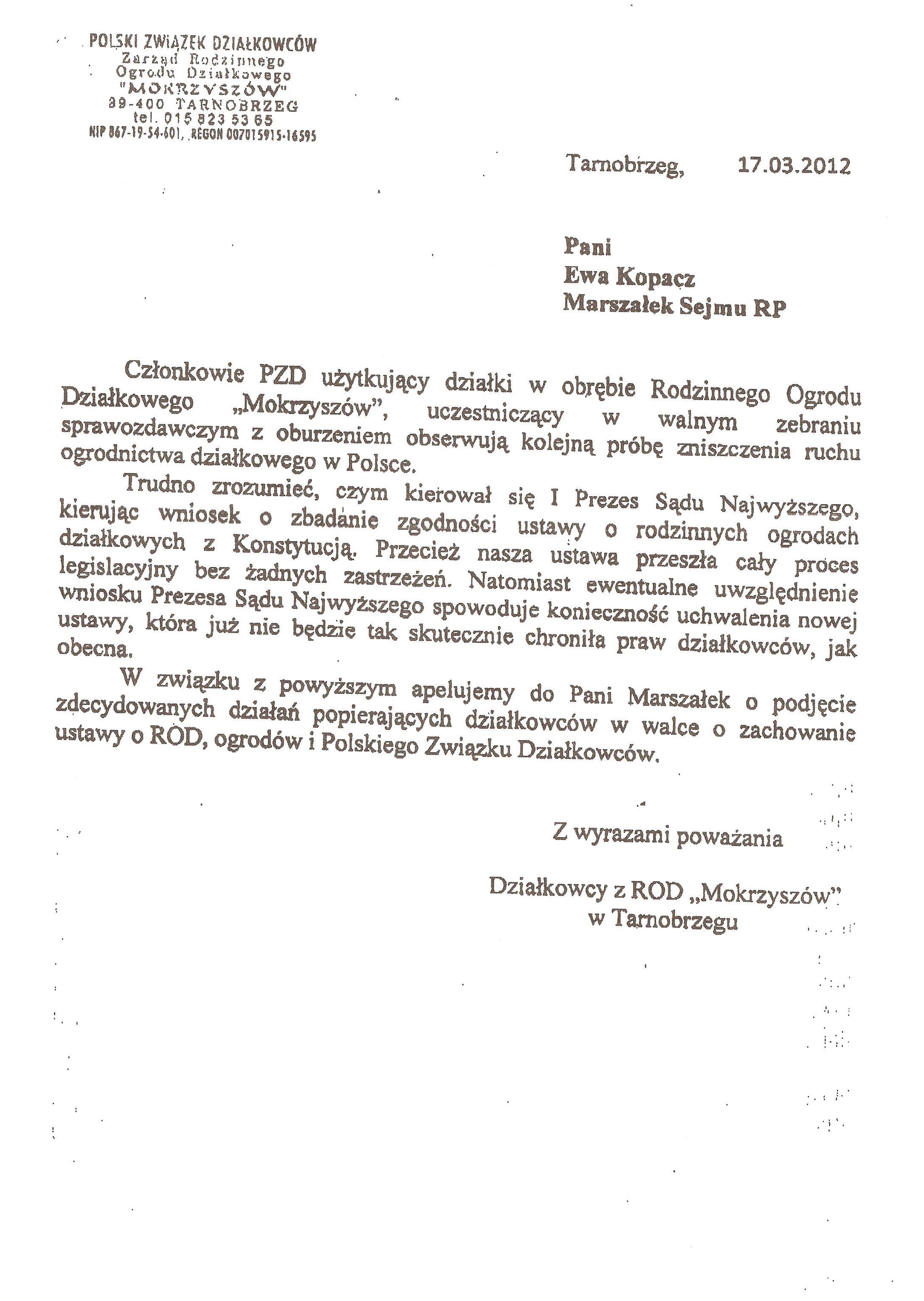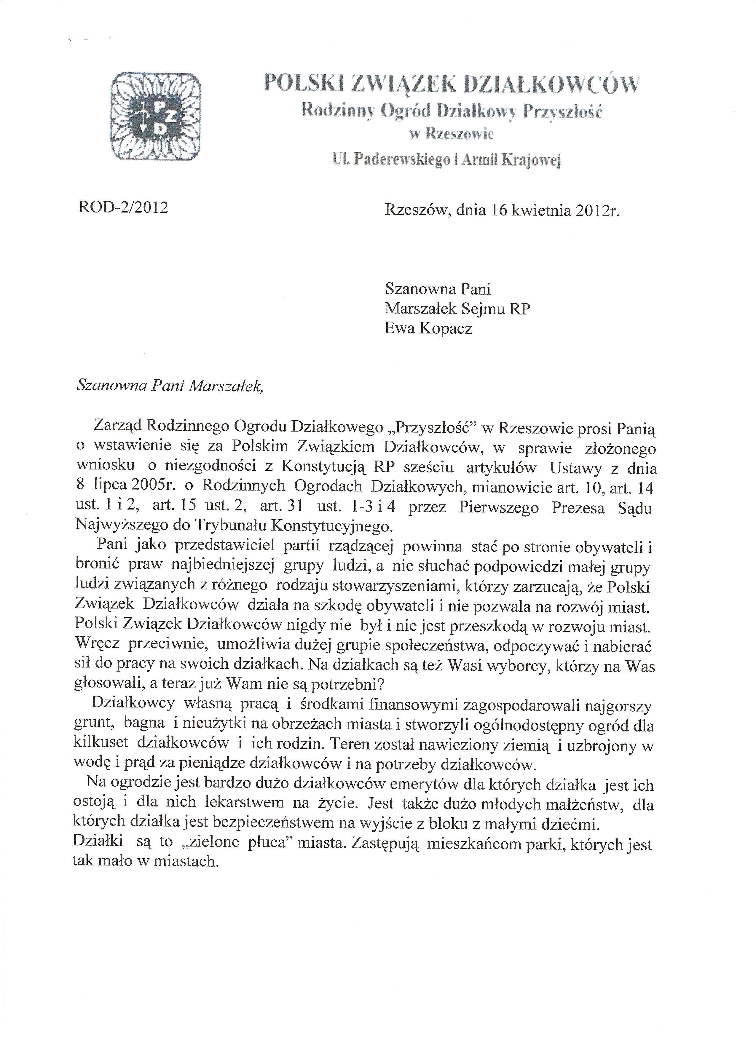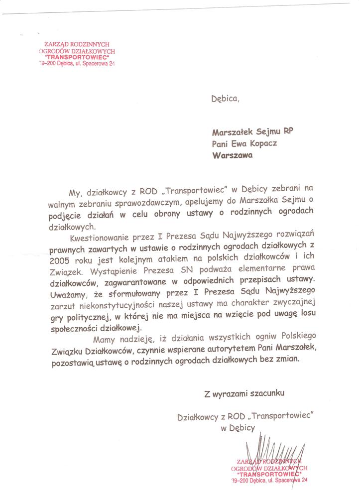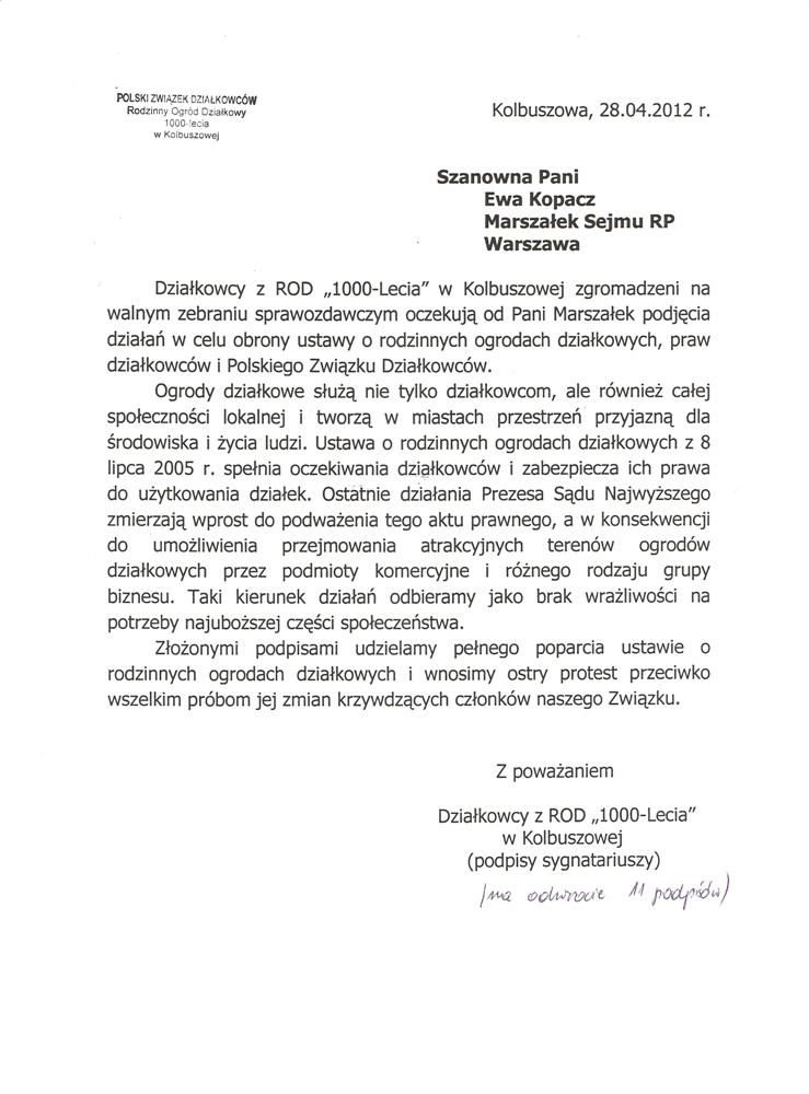 Ja jako Delegat z ziemi tarnobrzeskiej na IX Krajowy Zjazd Delegatów Polskiego Związku Działkowców z wielkim zadowoleniem przyjąłem Pani słowa ujęte w liście skierowane do nas uczestników IX Zjazdu Delegatów . Te słowa przyjąłem jako przejaw sympatii do nas działkowiczów a szczególnie do Ruchu Ogrodnictwa Działkowego w Polsce. Szanowna Pani - występuje w imieniu w imieniu pewnej części Działkowiczów województwa podkarpackiego o wsparcie nas w Sejmie w obronie naszej bardzo dobrej Ustawy o Rodzinnych Ogrodach Działkowych przed zakusami I Prezesa Sądu Najwyższego zaskarżającego ją do Trybunału Konstytucyjnego.