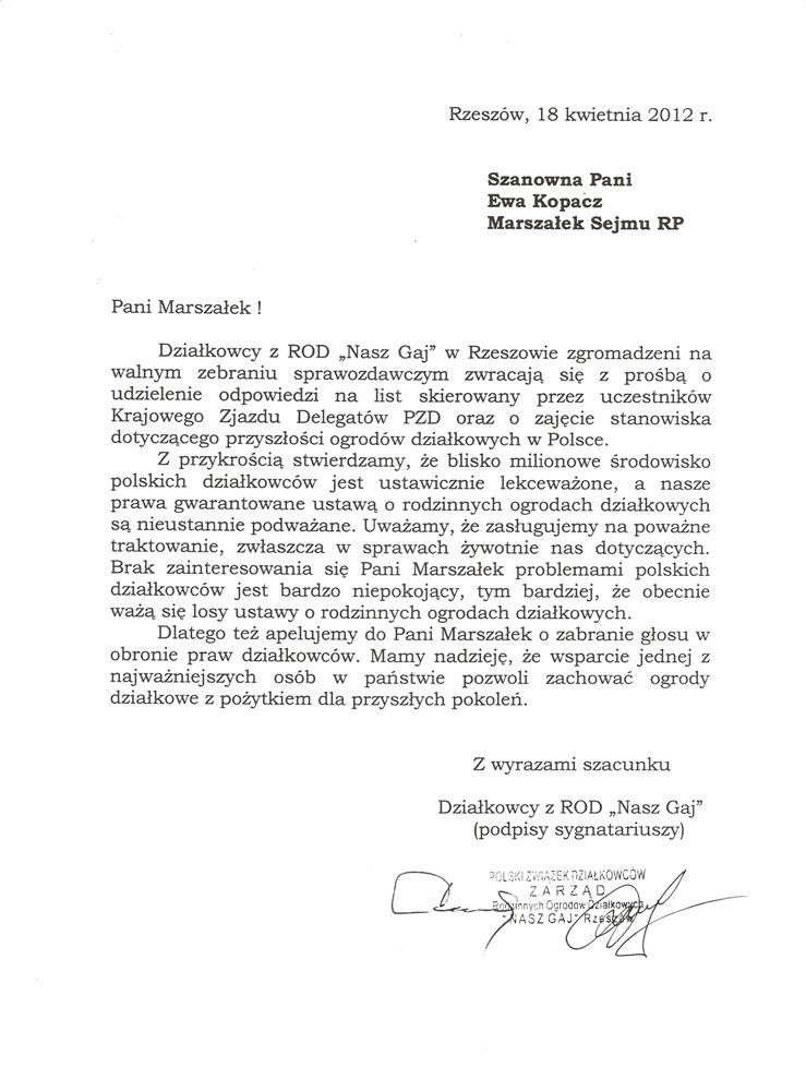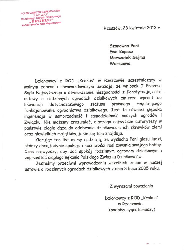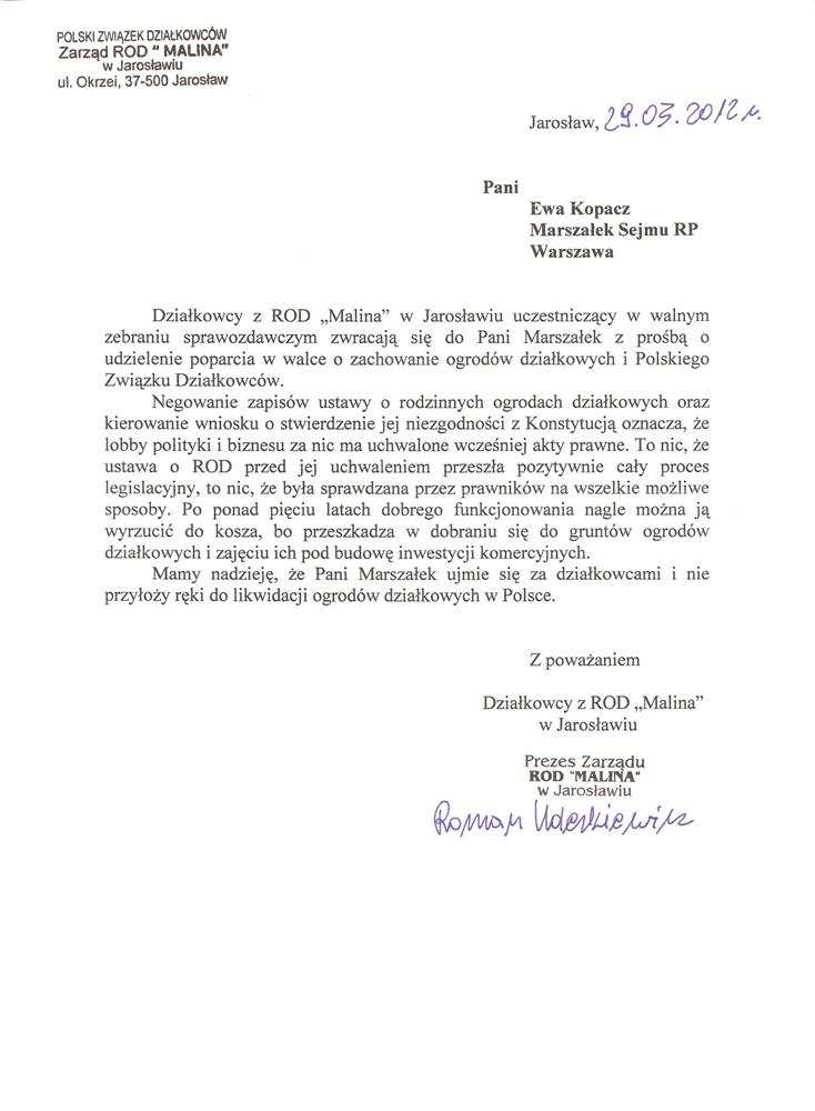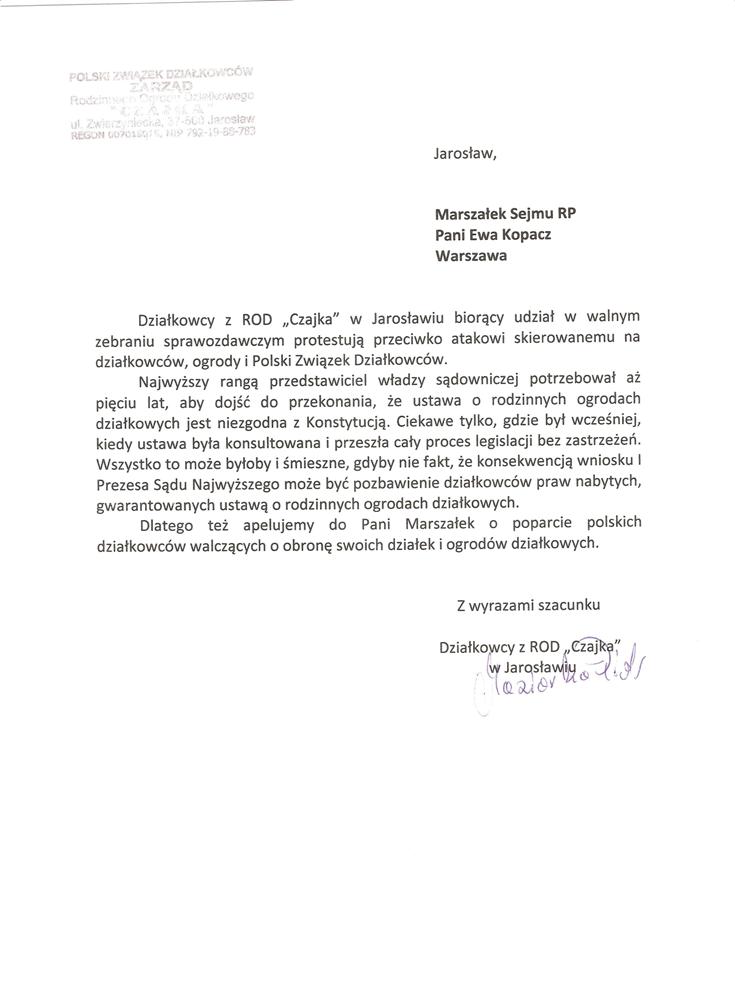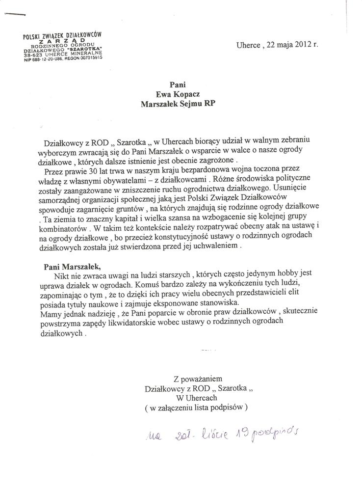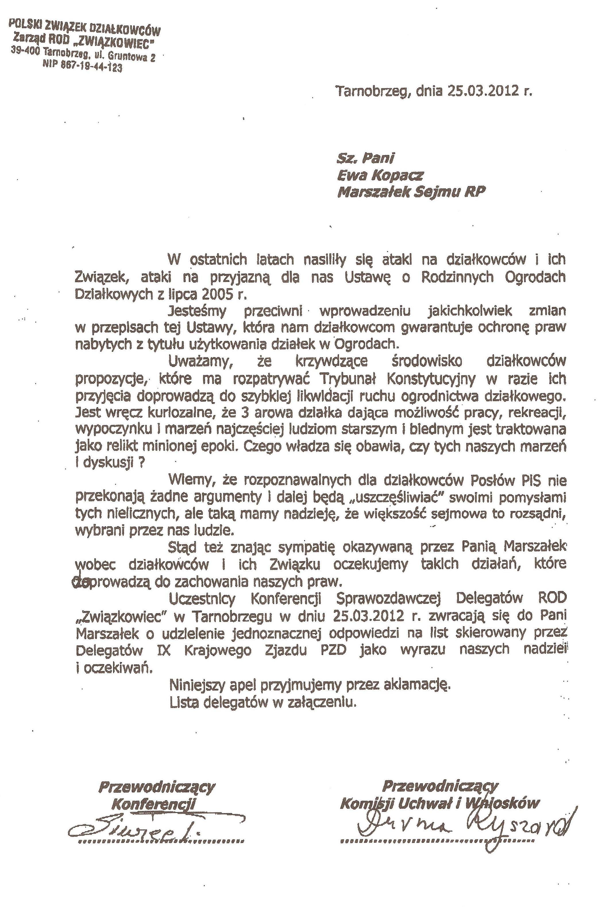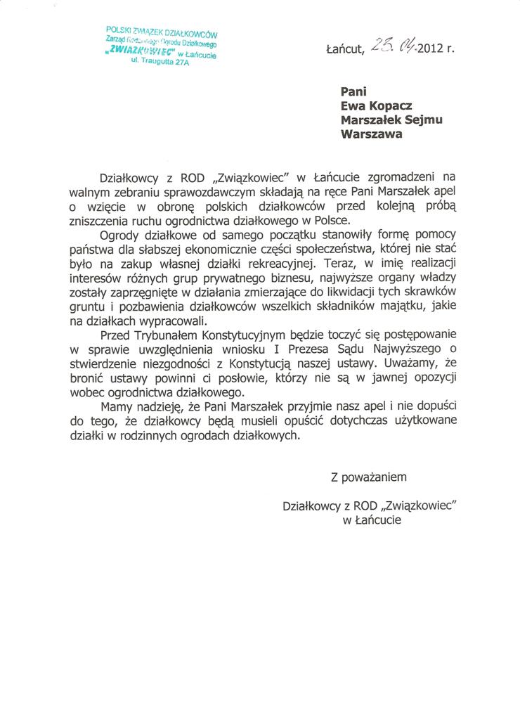 Ja jako Delegat z ziemi tarnobrzeskiej na IX Krajowy Zjazd Delegatów Polskiego Związku Działkowców z wielkim zadowoleniem przyjąłem Pani słowa ujęte w liście skierowane do nas uczestników IX Zjazdu Delegatów . Te słowa przyjąłem jako przejaw sympatii do nas działkowiczów a szczególnie do Ruchu Ogrodnictwa Działkowego w Polsce. Szanowna Pani - występuje w imieniu w imieniu pewnej części Działkowiczów województwa podkarpackiego o wsparcie nas w Sejmie w obronie naszej bardzo dobrej Ustawy o Rodzinnych Ogrodach Działkowych przed zakusami I Prezesa Sądu Najwyższego zaskarżającego ją do Trybunału Konstytucyjnego.