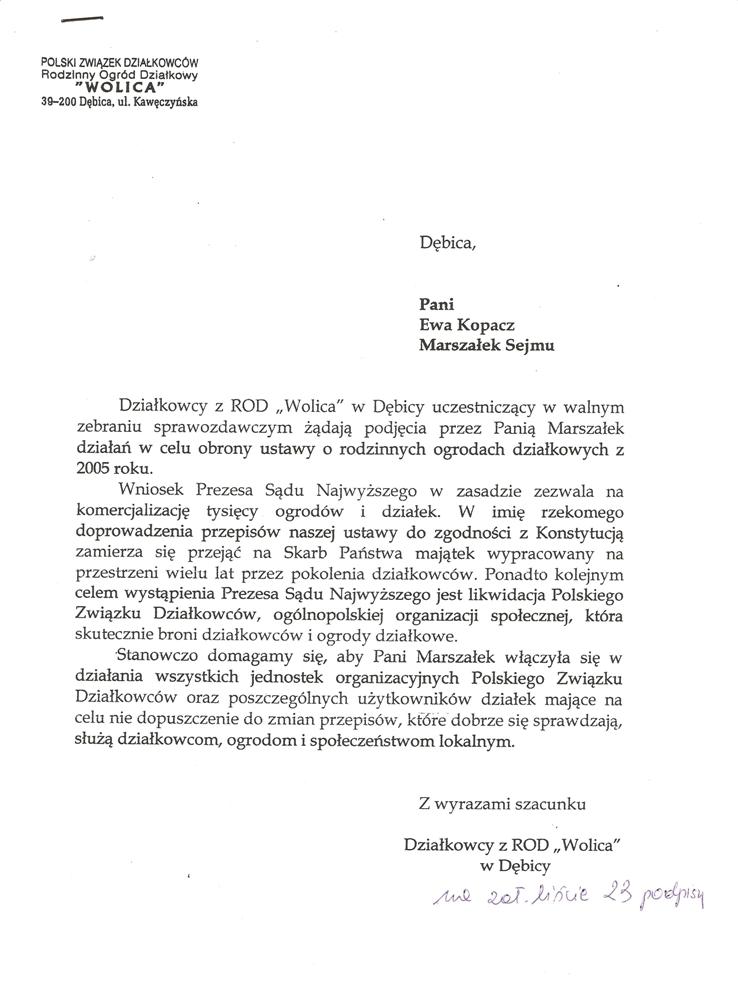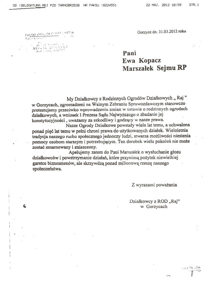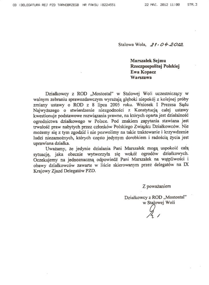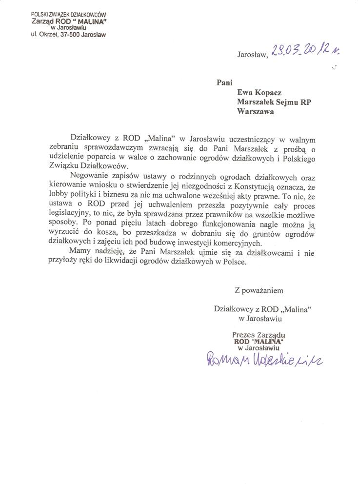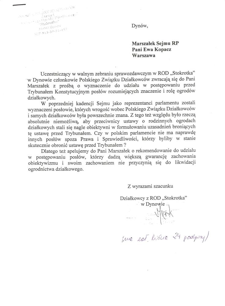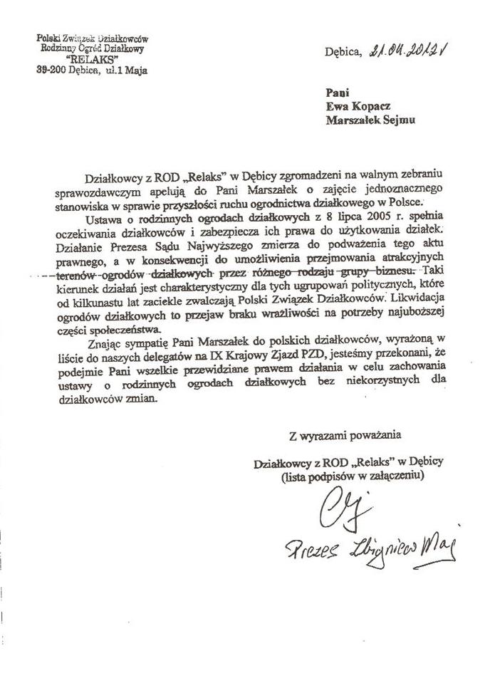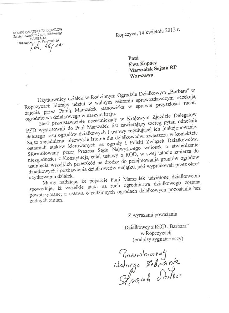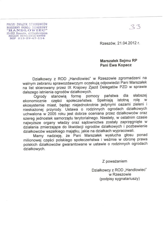 Ja jako Delegat z ziemi tarnobrzeskiej na IX Krajowy Zjazd Delegatów Polskiego Związku Działkowców z wielkim zadowoleniem przyjąłem Pani słowa ujęte w liście skierowane do nas uczestników IX Zjazdu Delegatów . Te słowa przyjąłem jako przejaw sympatii do nas działkowiczów a szczególnie do Ruchu Ogrodnictwa Działkowego w Polsce. Szanowna Pani - występuje w imieniu w imieniu pewnej części Działkowiczów województwa podkarpackiego o wsparcie nas w Sejmie w obronie naszej bardzo dobrej Ustawy o Rodzinnych Ogrodach Działkowych przed zakusami I Prezesa Sądu Najwyższego zaskarżającego ją do Trybunału Konstytucyjnego.