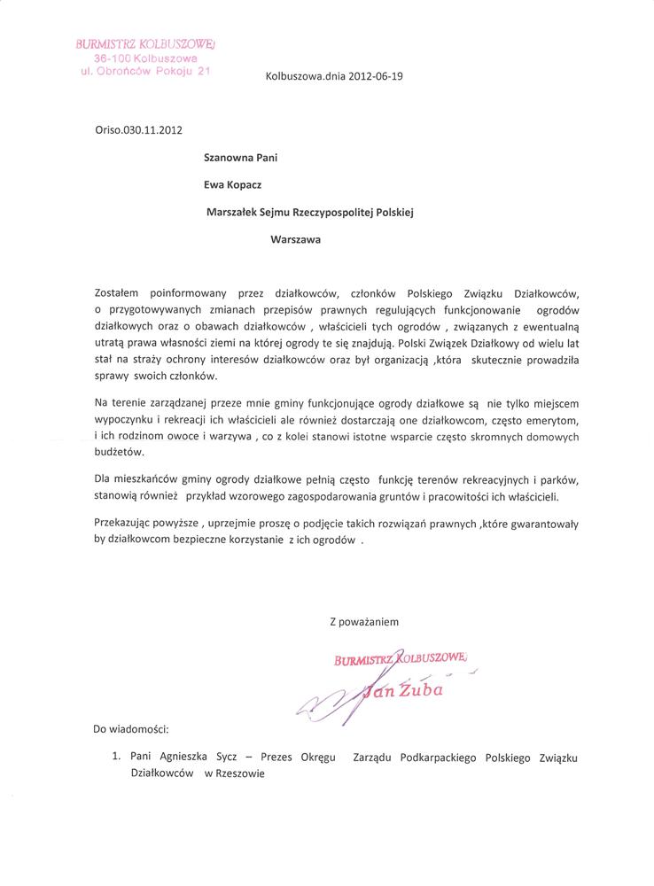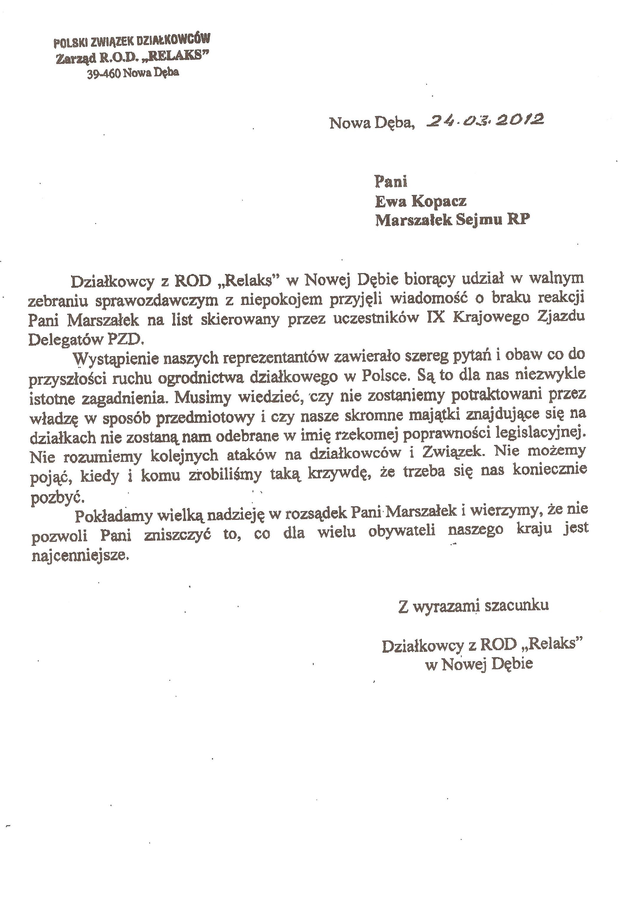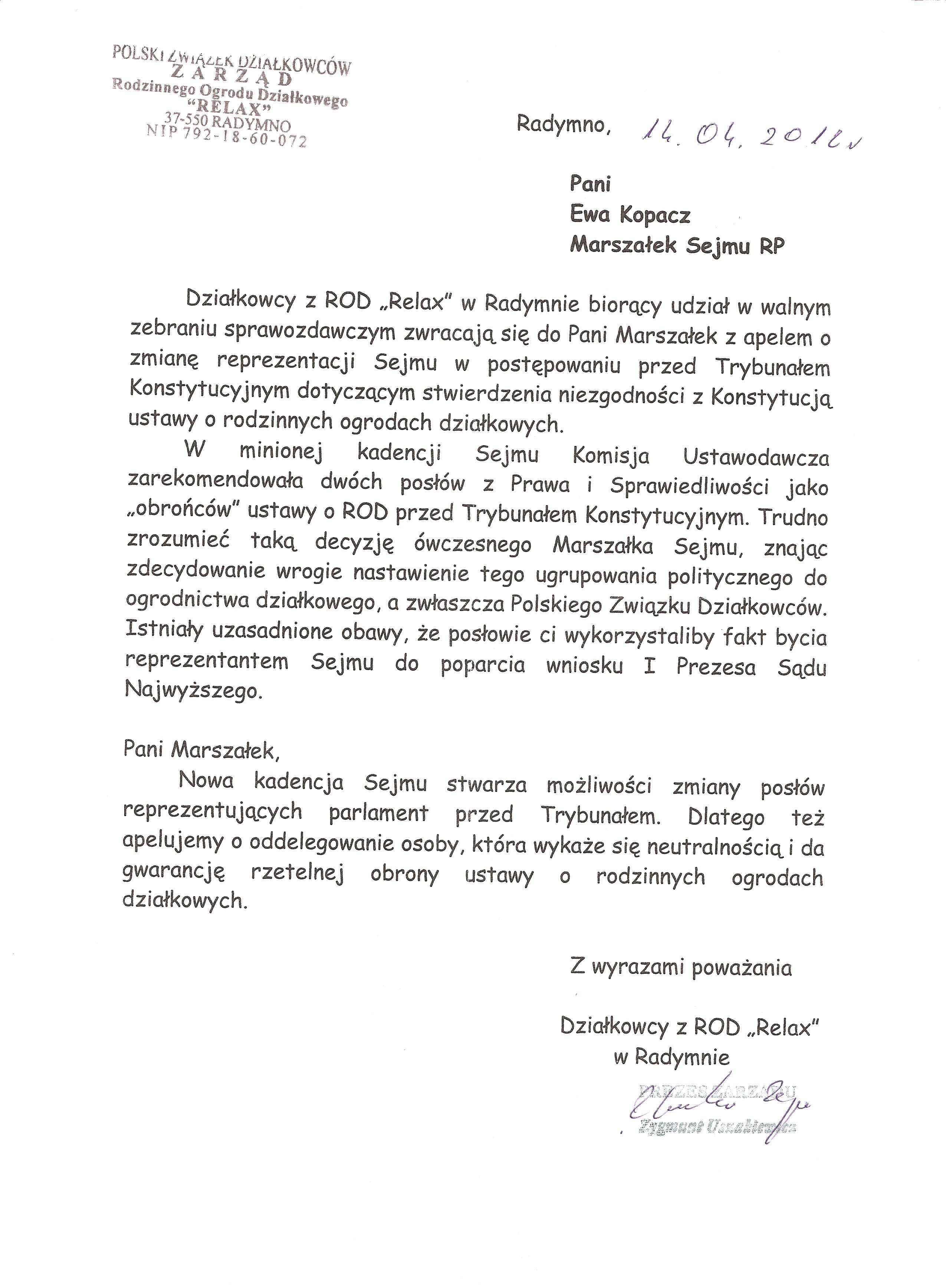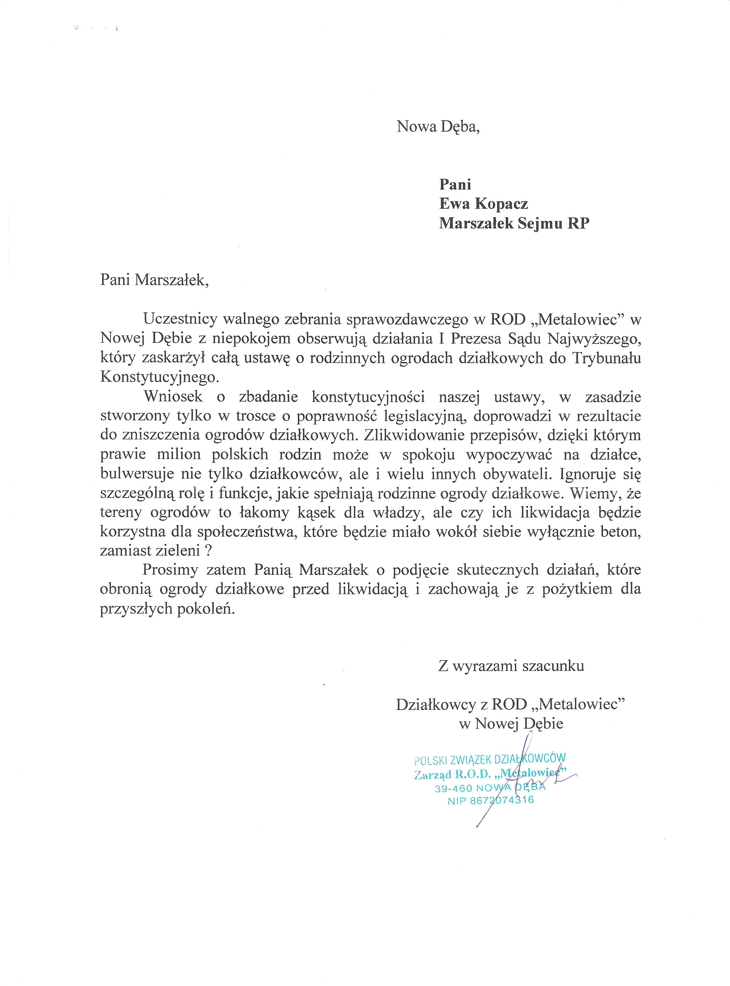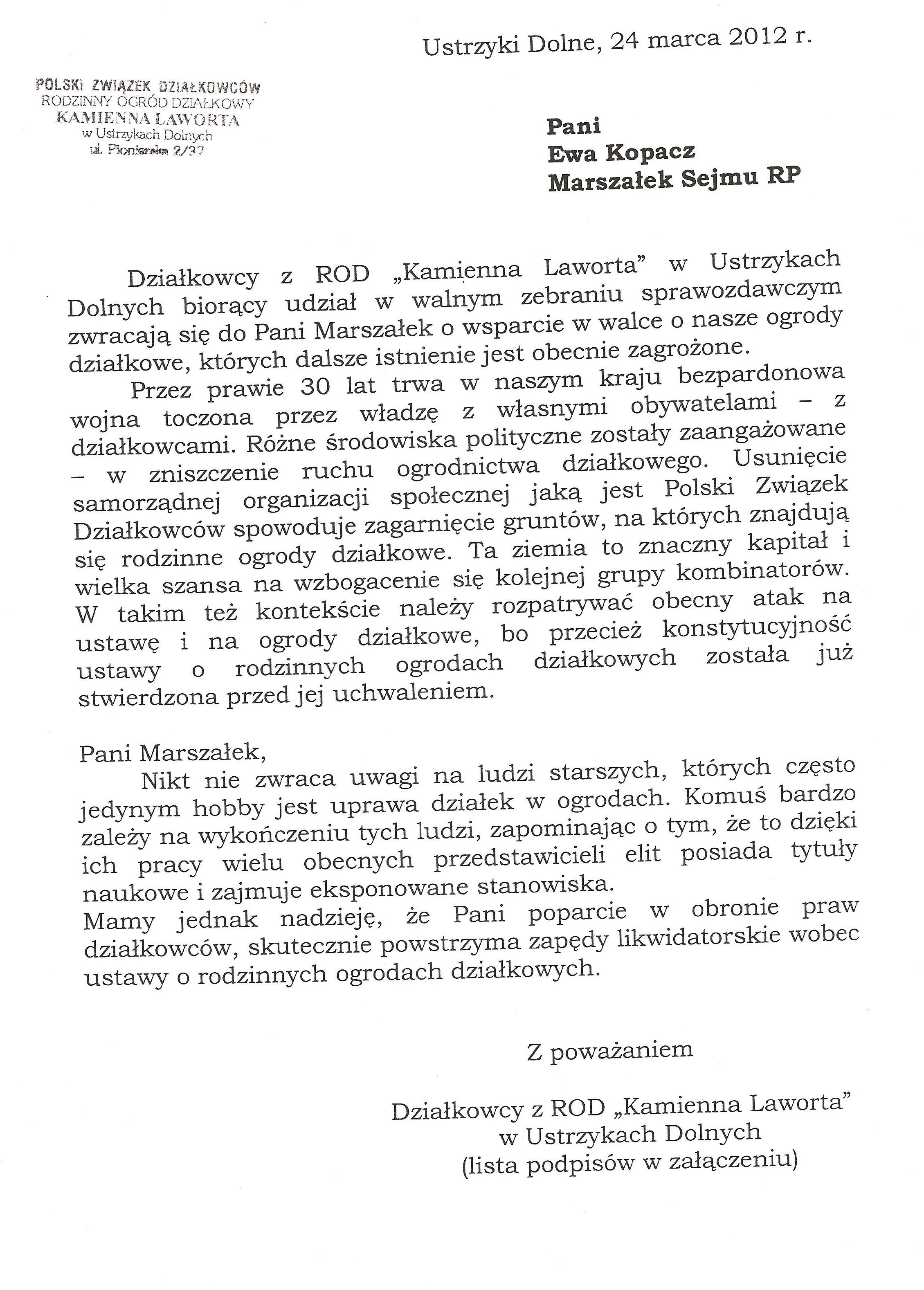 Ja jako Delegat z ziemi tarnobrzeskiej na IX Krajowy Zjazd Delegatów Polskiego Związku Działkowców z wielkim zadowoleniem przyjąłem Pani słowa ujęte w liście skierowane do nas uczestników IX Zjazdu Delegatów . Te słowa przyjąłem jako przejaw sympatii do nas działkowiczów a szczególnie do Ruchu Ogrodnictwa Działkowego w Polsce. Szanowna Pani - występuje w imieniu w imieniu pewnej części Działkowiczów województwa podkarpackiego o wsparcie nas w Sejmie w obronie naszej bardzo dobrej Ustawy o Rodzinnych Ogrodach Działkowych przed zakusami I Prezesa Sądu Najwyższego zaskarżającego ją do Trybunału Konstytucyjnego.