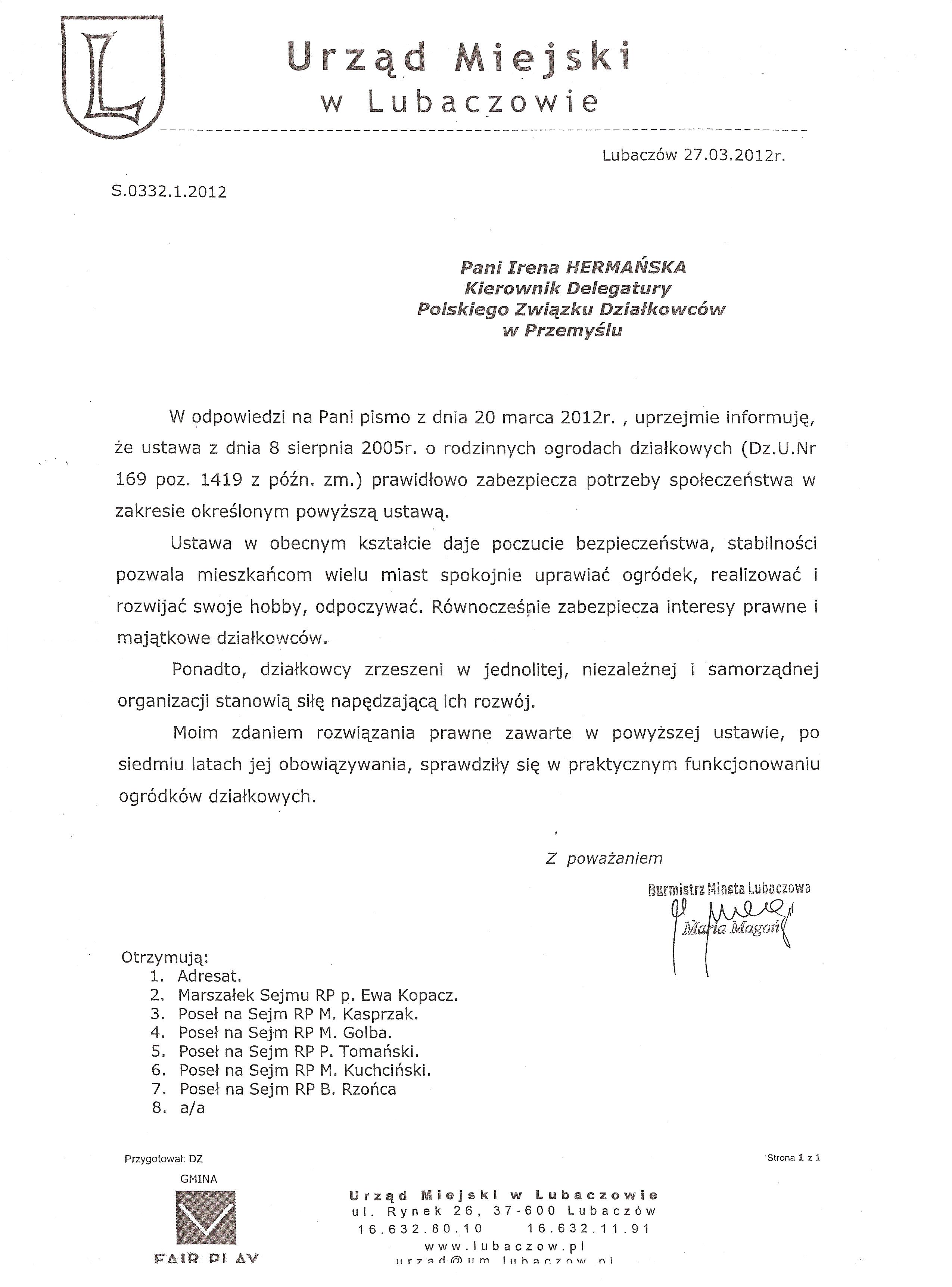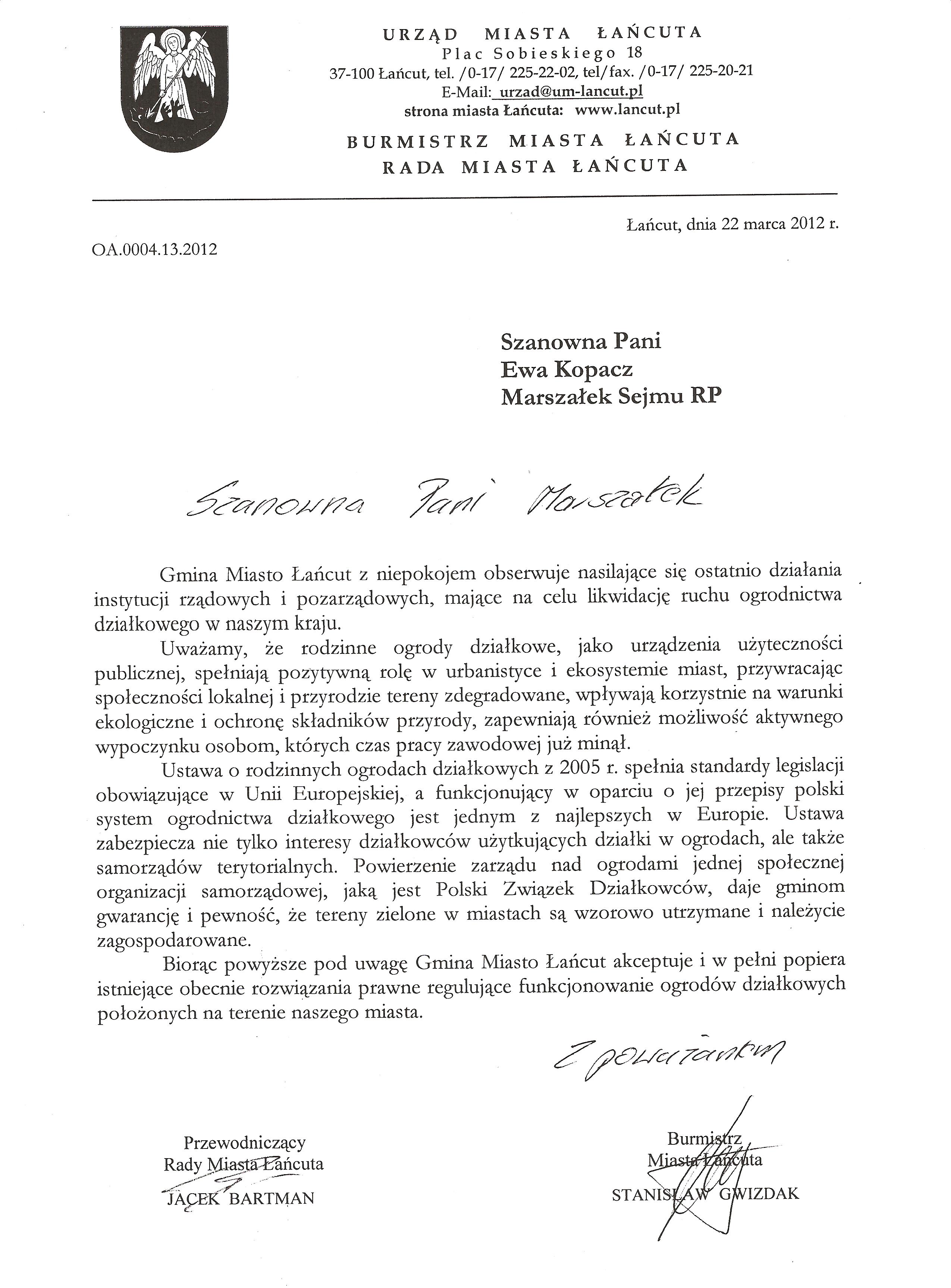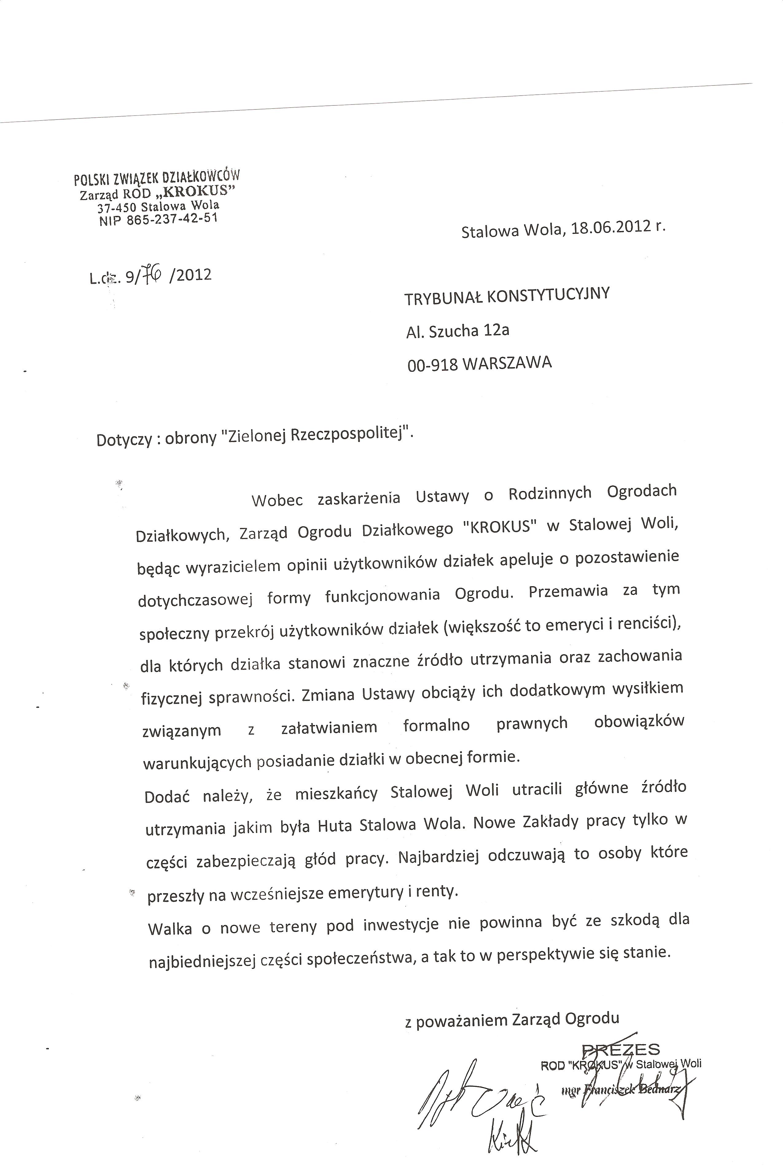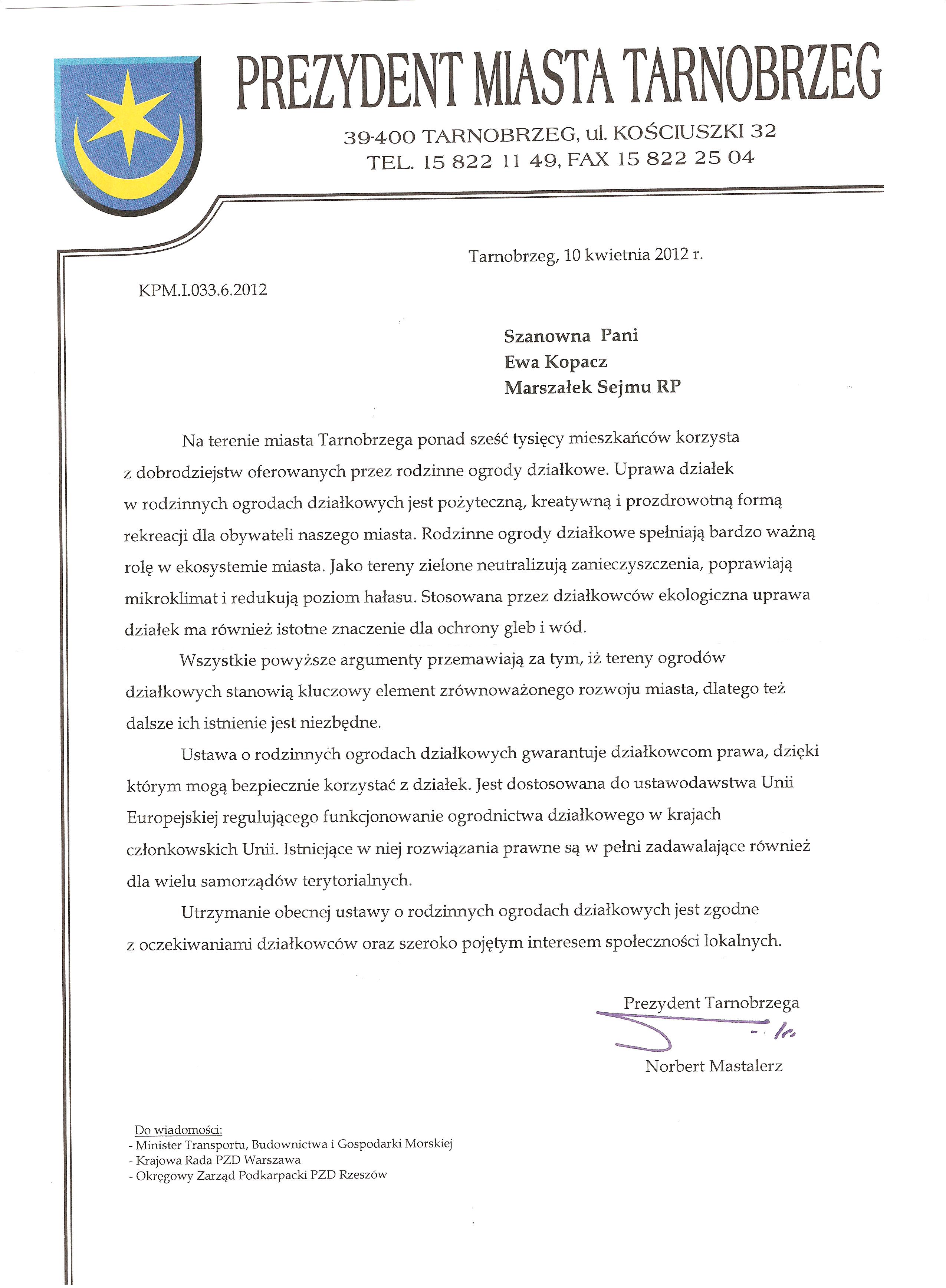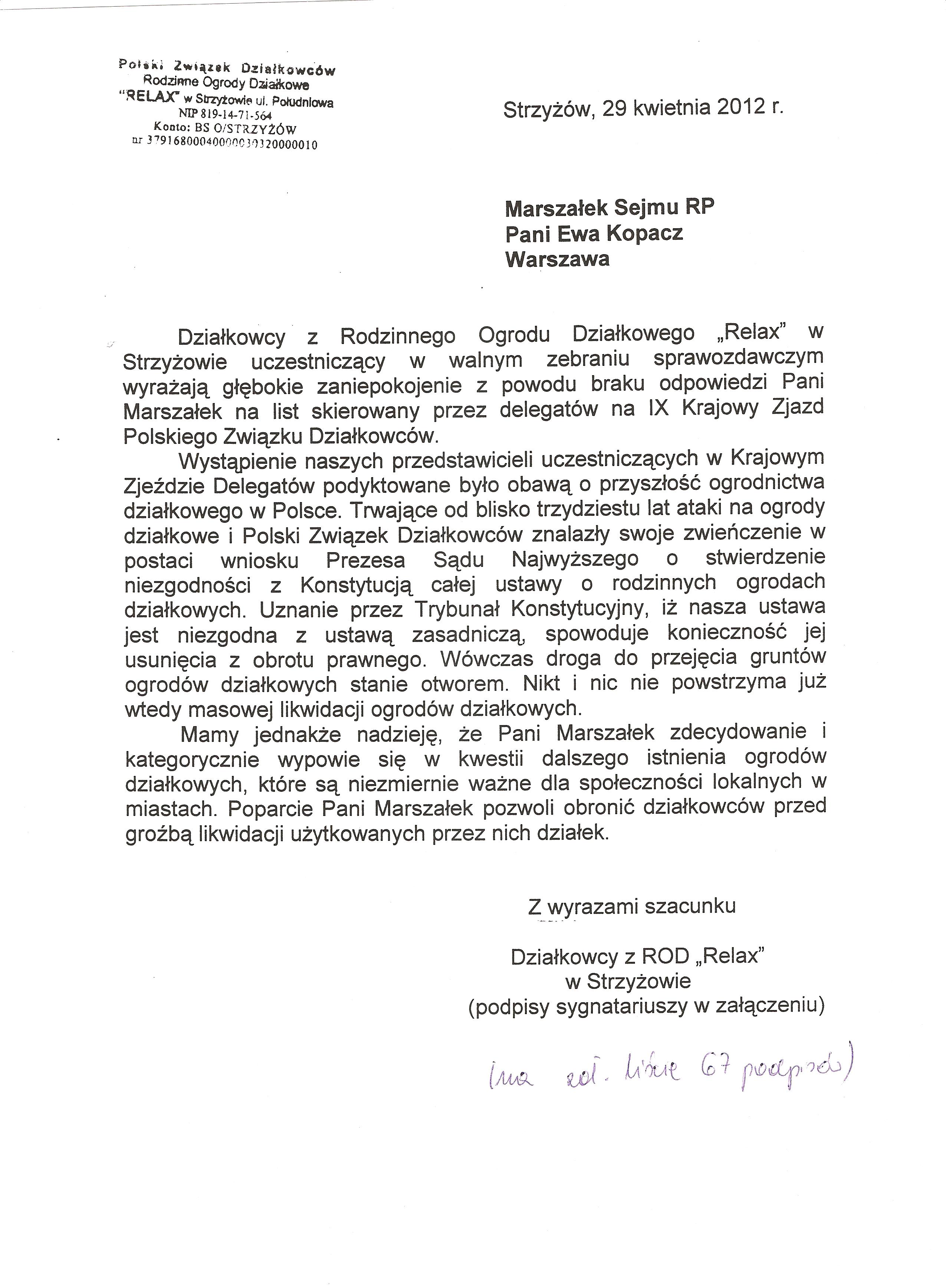 Ja jako Delegat z ziemi tarnobrzeskiej na IX Krajowy Zjazd Delegatów Polskiego Związku Działkowców z wielkim zadowoleniem przyjąłem Pani słowa ujęte w liście skierowane do nas uczestników IX Zjazdu Delegatów . Te słowa przyjąłem jako przejaw sympatii do nas działkowiczów a szczególnie do Ruchu Ogrodnictwa Działkowego w Polsce. Szanowna Pani - występuje w imieniu w imieniu pewnej części Działkowiczów województwa podkarpackiego o wsparcie nas w Sejmie w obronie naszej bardzo dobrej Ustawy o Rodzinnych Ogrodach Działkowych przed zakusami I Prezesa Sądu Najwyższego zaskarżającego ją do Trybunału Konstytucyjnego.
