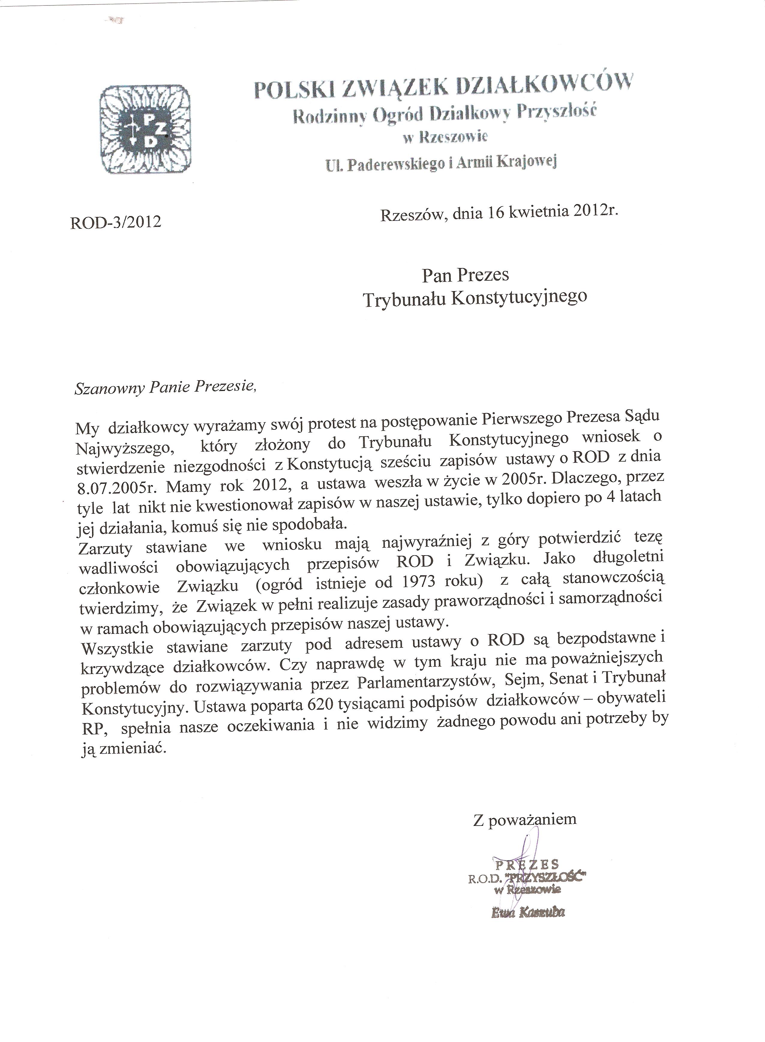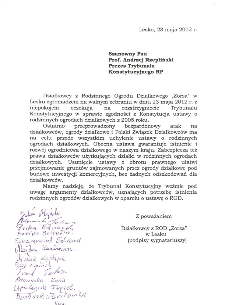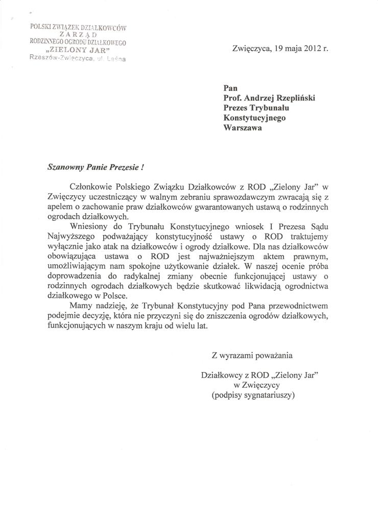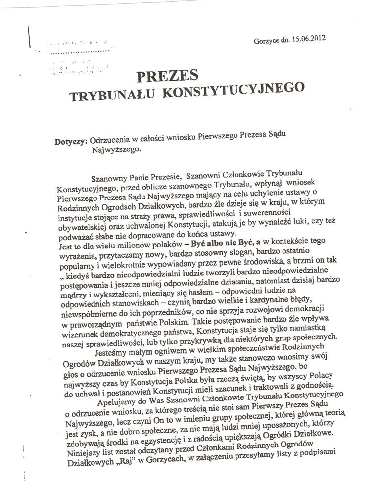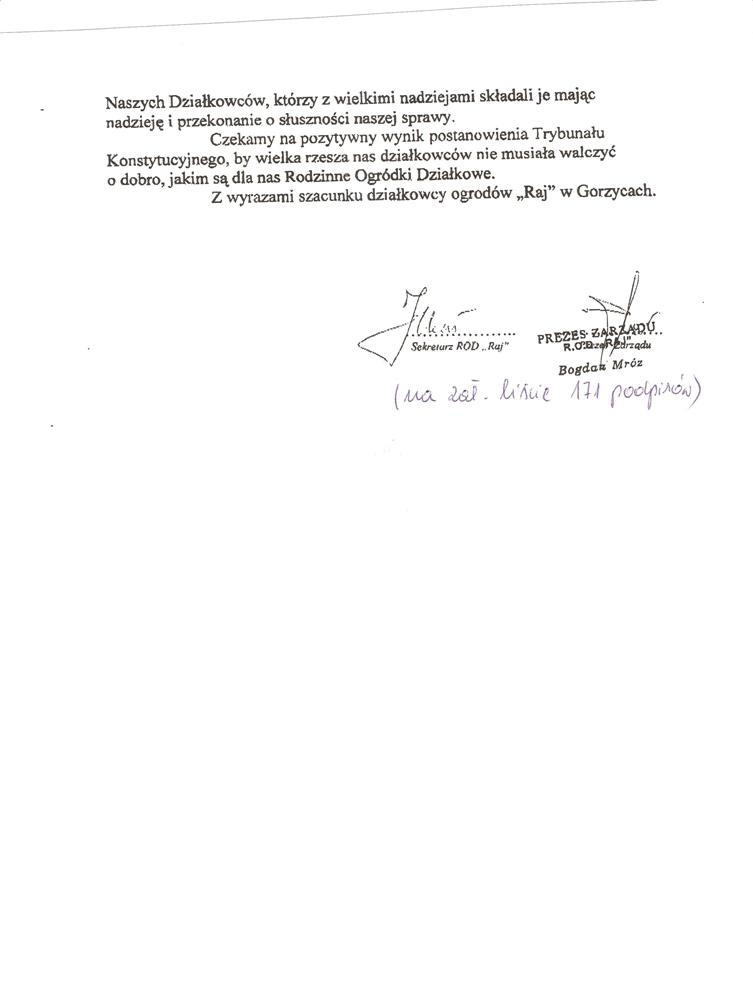 Składamy wyrazy uznania za to, iż stanął Pan po stronie działkowców i naszej organizacji. Mamy również nadzieję – nikłą co prawda – że Pana głos rozpocznie szeroką dyskusję nad celowością i słusznością wyroku Trybunału Konstytucyjnego.