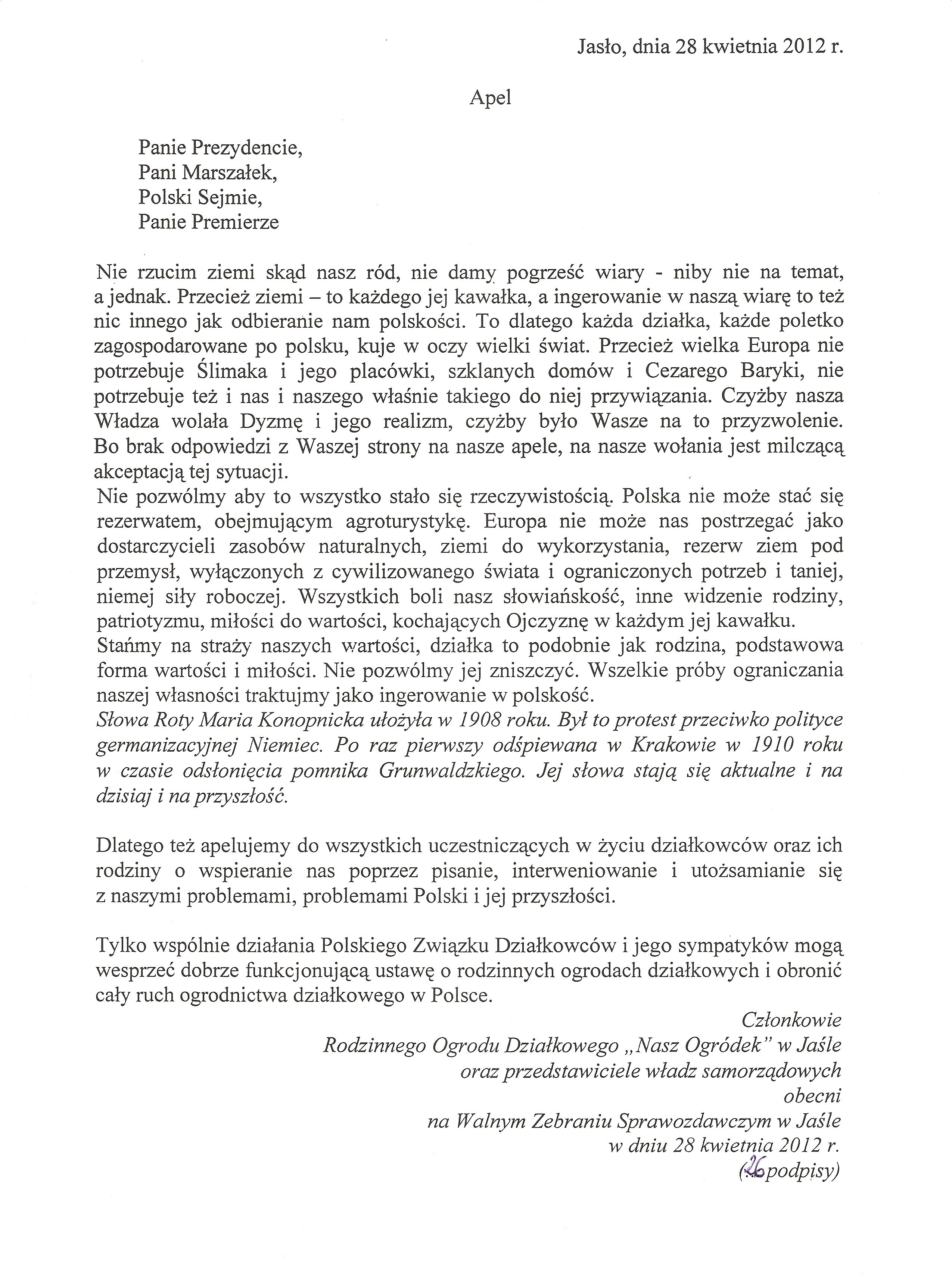 Jedyna nadzieja pozostaje w Was, Panie i Panowie posłowie na Sejm RP – nie zapominajcie o działkowcach, których tak żarliwie broniliście podczas II Kongresu PZD. Nie dopuśćcie do zniszczenia ruchu ogrodnictwa działkowego, który przez szereg lat dobrze służył naszej Ojczyźnie !