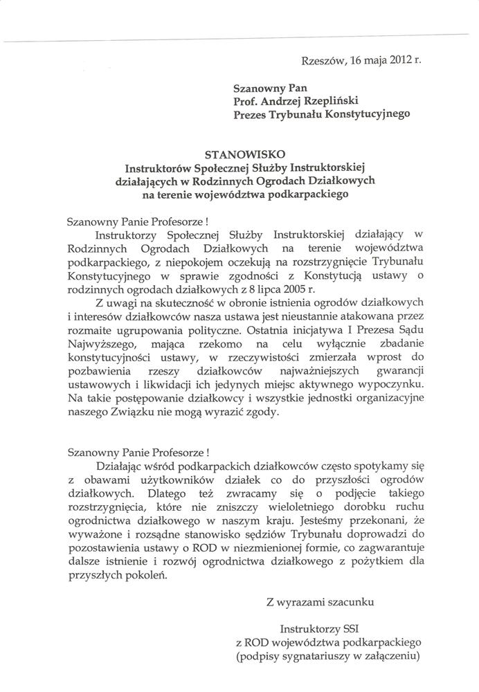 Przedstawiciele podkarpackich działkowców uczestniczący w Konferencji Okręgowej Polskiego Związku Działkowców w Rzeszowie składają na Pana ręce podziękowania za słowa, jakie zawarł Pan w zdaniu odrębnym do wyroku Trybunału Konstytucyjnego z dnia 11 lipca 2012 r.