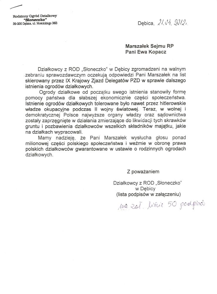 Znając Pani sympatię do działkowców, wyrażoną w życzeniach skierowanych do IX Krajowego Zjazdu Delegatów PZD, zwracamy się o poparcie działań wszystkich jednostek organizacyjnych Związku zmierzających do zachowania ustawy o ROD w niezmienionym kształcie.