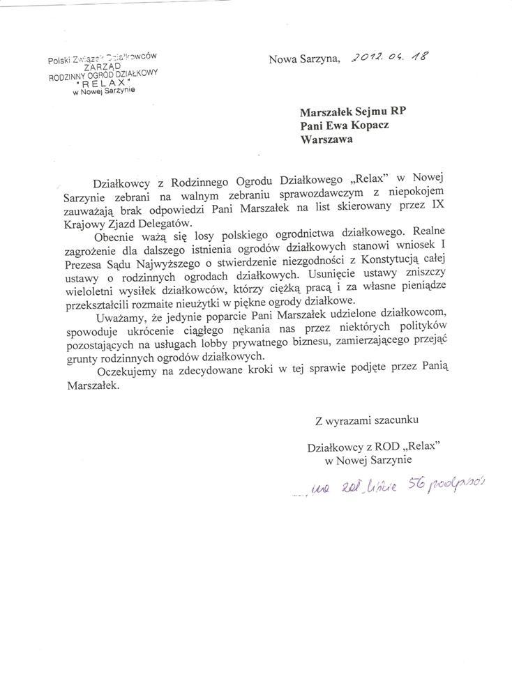 Piszę do Pani jako delegat na IX Krajowy Zjazd Delegatów PZD oraz jeden z sygnatariuszy listu otwartego skierowanego do Marszałka Sejmu przez ten najwyższy organ decyzyjny Polskiego Związku Działkowców. Zwracam się z prośbą o odpowiedź na zawarte w nim kwestie dotyczące przyszłości ogrodów działkowych w Polsce. Z przykrością stwierdzam, że nie odniosła się Pani do listu wysłanego przez reprezentantów ponad miliona członków PZD. Mam nadzieję, że nie jest to przejaw ignorancji działkowców przez najwyższy urząd naszego państwa, a zwłoka w odpowiedzi spowodowana jest tylko koniecznością wypełniania przez Panią Marszałek szeregu ważnych obowiązków.